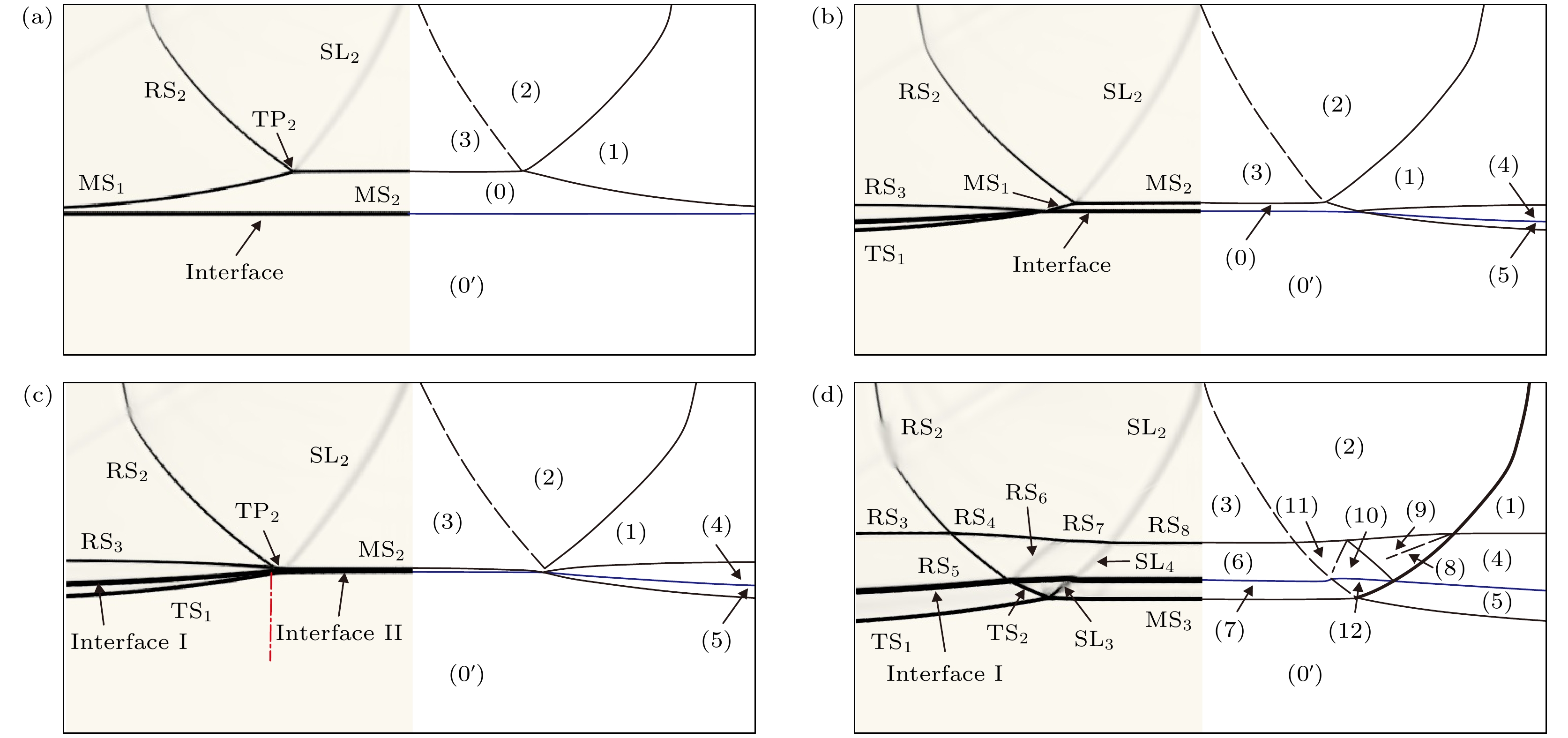 图 6 马赫反射波系与平面界面作用过程的数值纹影图(左)和波系示意图(右) (a) t = –4 μs; (b) t = –1 μs; (c) t = 0 μs; (d) t = 5 μs