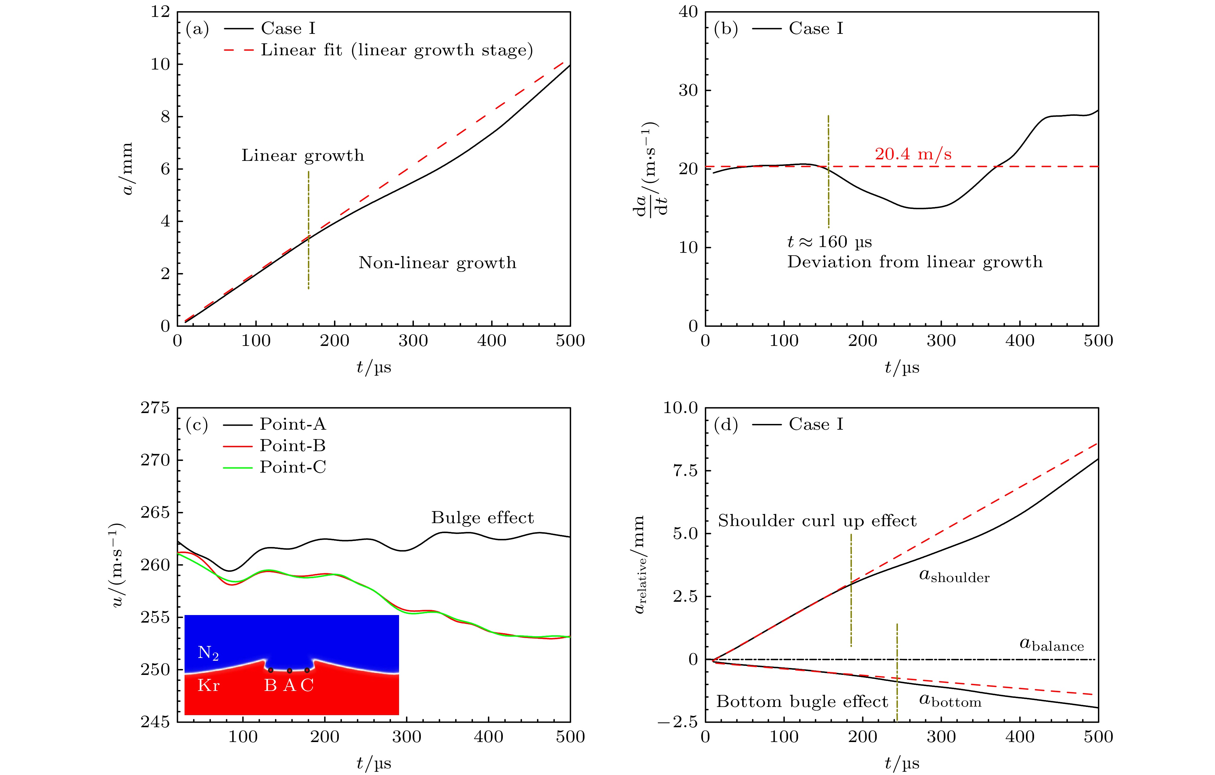 图 9 情形I界面演化定量分析 (a) 界面扰动振幅; (b) 界面扰动增长率; (c) 气泡头部速度; (d) 凹腔肩部和底部的高度