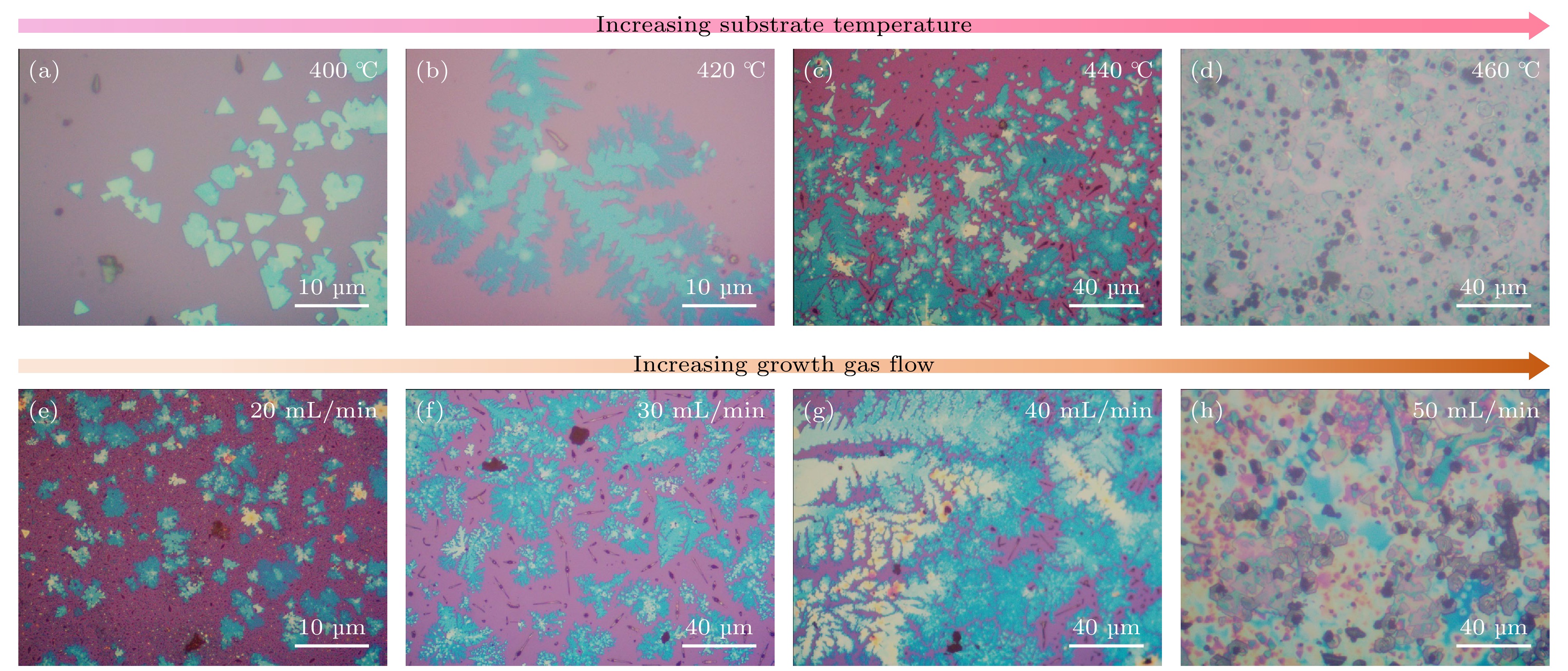 Fig. 3. (a)–(d) Optical images of In2Se3 flakes grown at gas flow rate of 20 mL/min (standard condition) and different growth temperature; (e)–(h) optical images of In2Se3 flakes grown at 440 ℃ and different gas flow rate (standard condition).