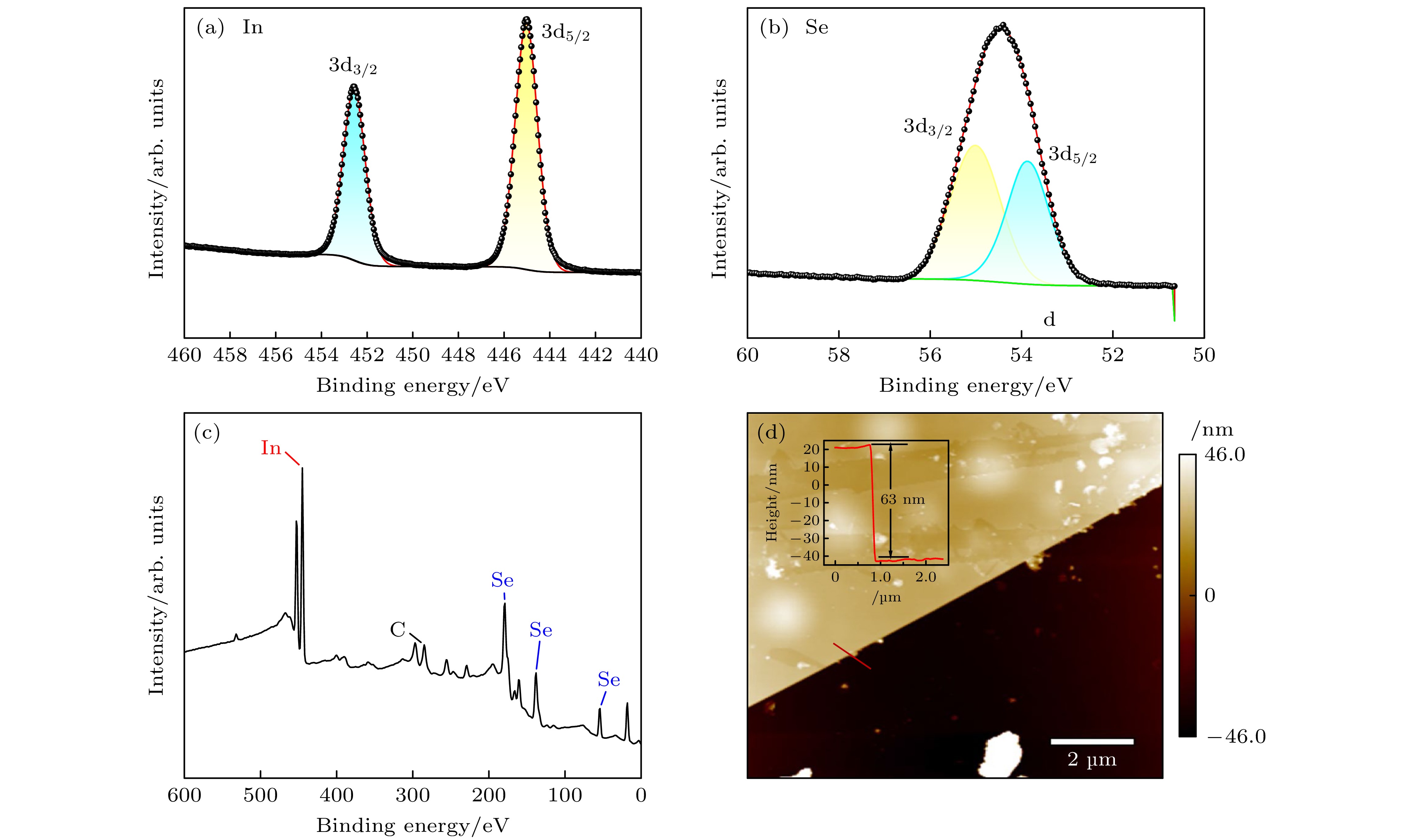 图 5 (a) In 3d3/2和In 3d5/2的XPS能谱; (b) Se 3d3/2和Se 3d5/2的XPS能谱; (c) 合成α-In2Se3的XPS能谱; (d) α-In2Se3 AFM图像及对应的高度剖面图