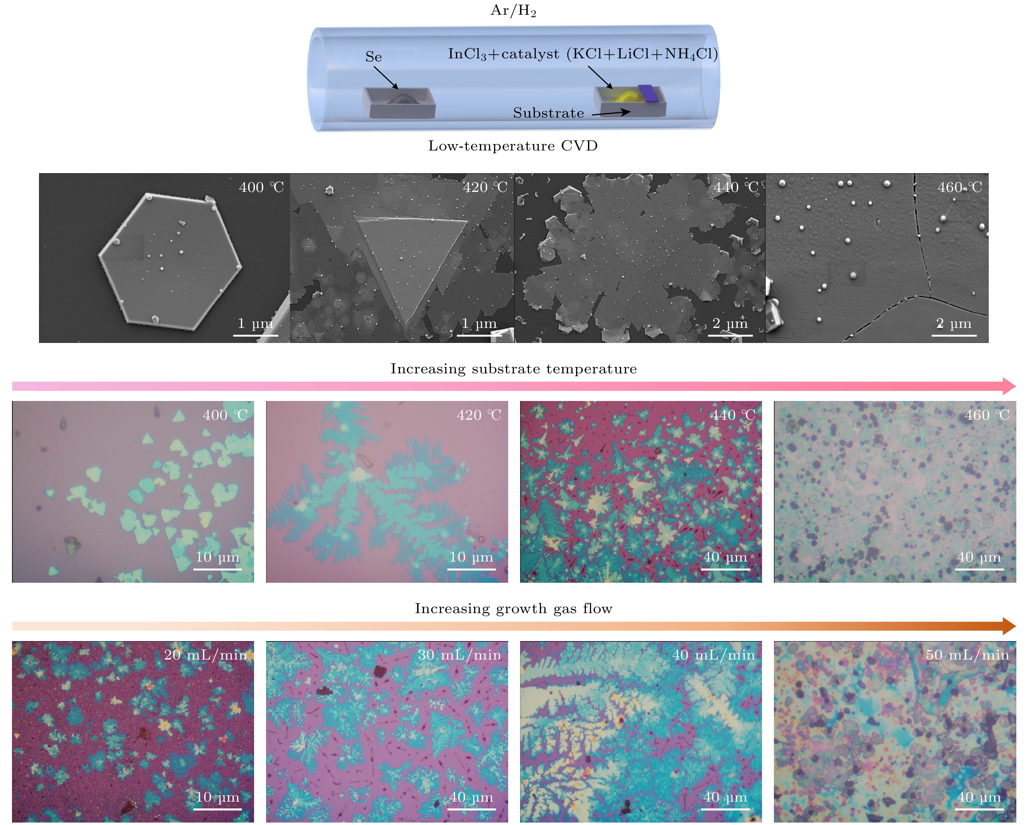图 3 (a)—(d) 在20 mL/min (标准状况)气体流量、不同生长温度下, 生长的In2Se3薄片光学显微图; (e)—(h) 在440 ℃、不同气体流量(标准状况)下, 生长的In2Se3薄片光学显微图