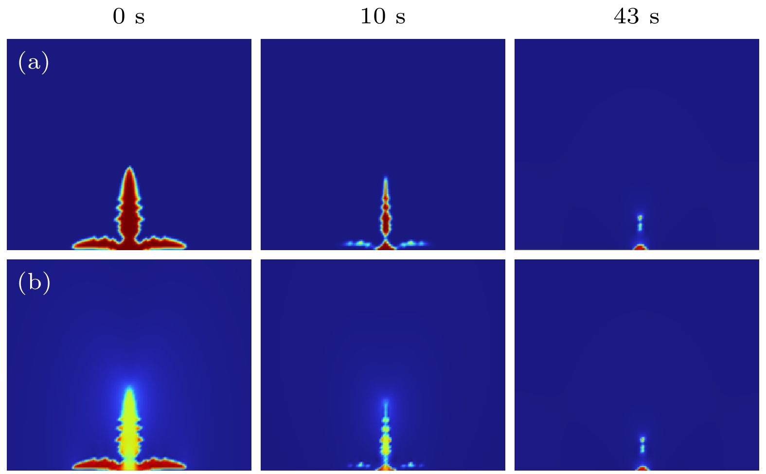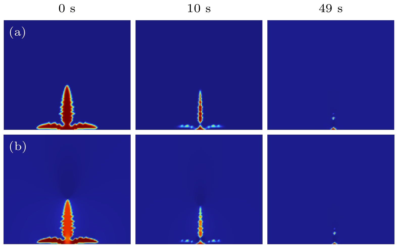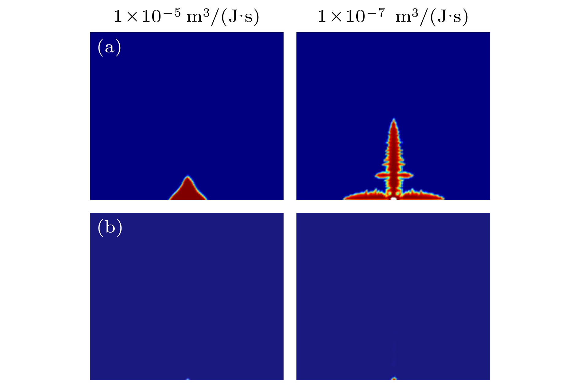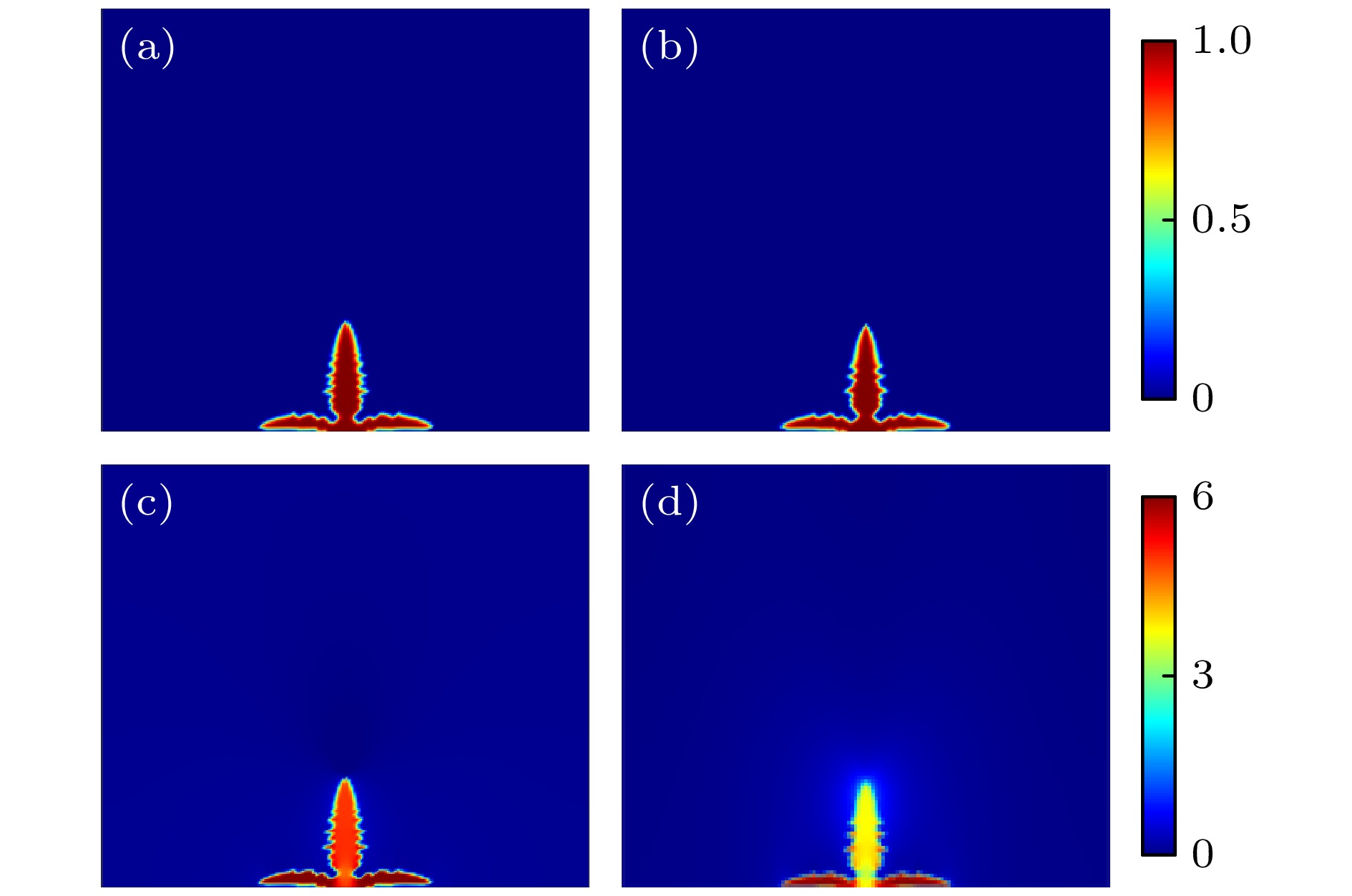 图 1 不同相场模型下锂枝晶的生长情况 (a) 未耦合传热模型的锂枝晶形貌; (b) 耦合传热模型的锂枝晶形貌; (c) 未耦合传热模型的von Mises应力(单位: MPa); (d) 耦合传热模型的von Mises应力(单位: MPa)