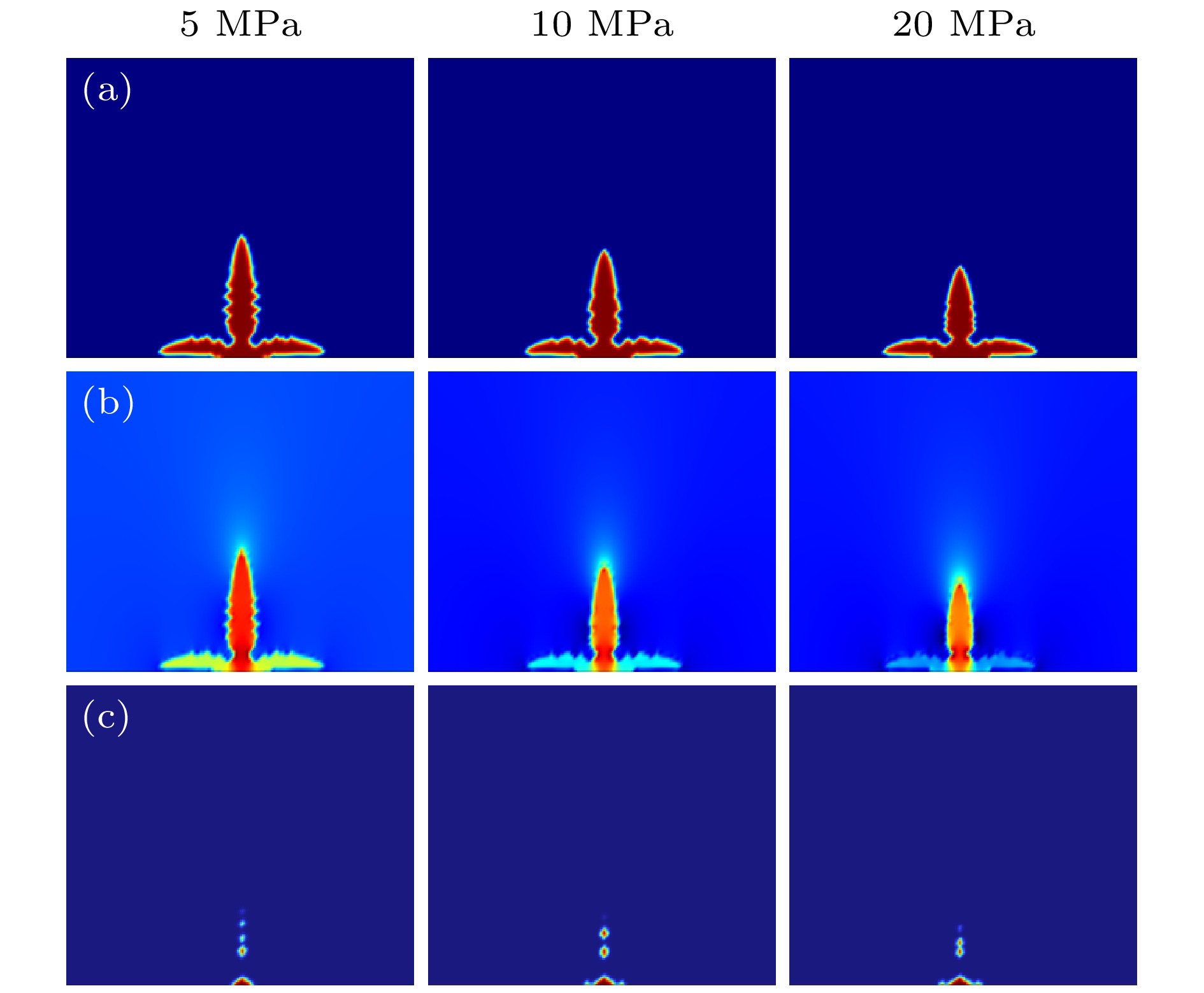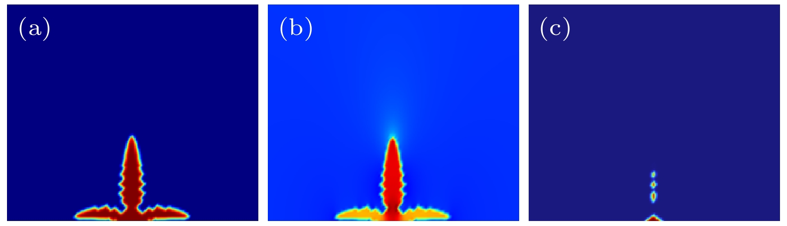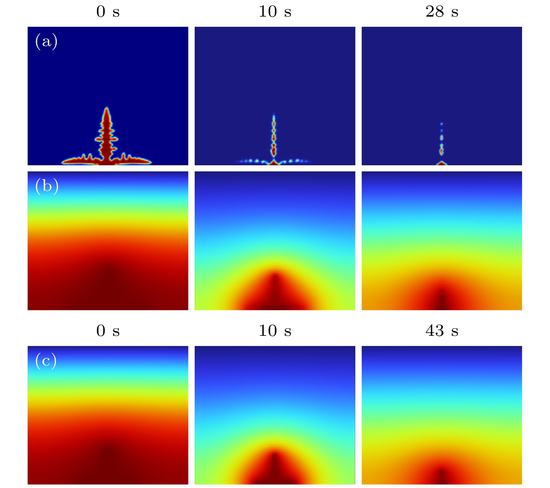 图 7 锂枝晶的溶解以及相场温度变化情况 (a) 未耦合力学场锂枝晶溶解情况; (b) 未耦合力学场温度变化; (c) 耦合力学场温度变化
