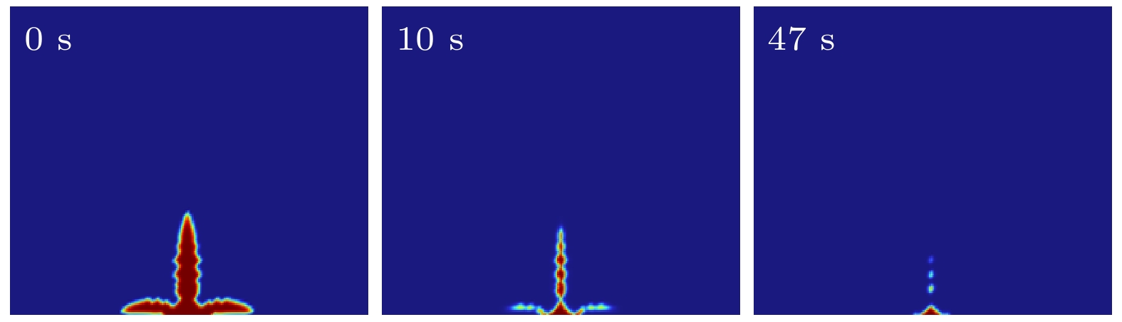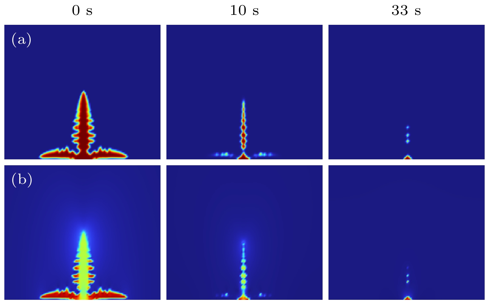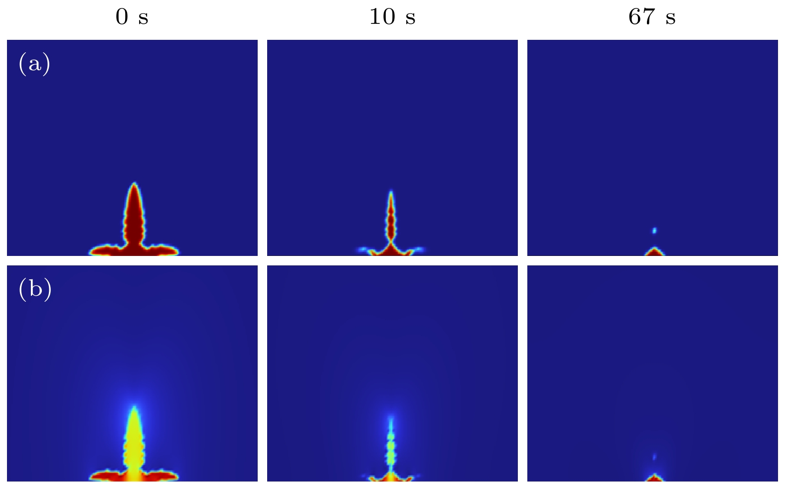 图 7 锂枝晶的溶解以及相场温度变化情况 (a) 未耦合力学场锂枝晶溶解情况; (b) 未耦合力学场温度变化; (c) 耦合力学场温度变化