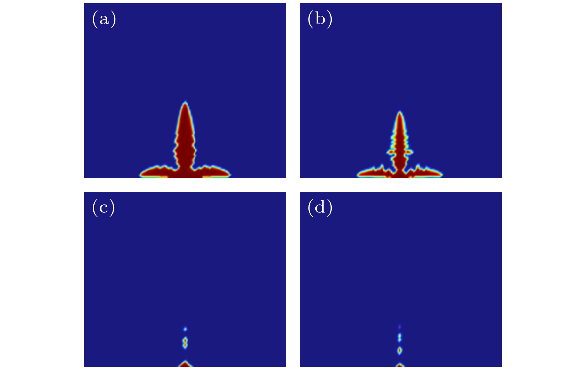 图 11 不同扩散系数下锂枝晶的生长与溶解情况 (a) 增大扩散系数锂枝晶形貌; (b) 减小扩散系数锂枝晶形貌; (c) 增大扩散系数死锂形貌; (d) 减小扩散系数死锂形貌
