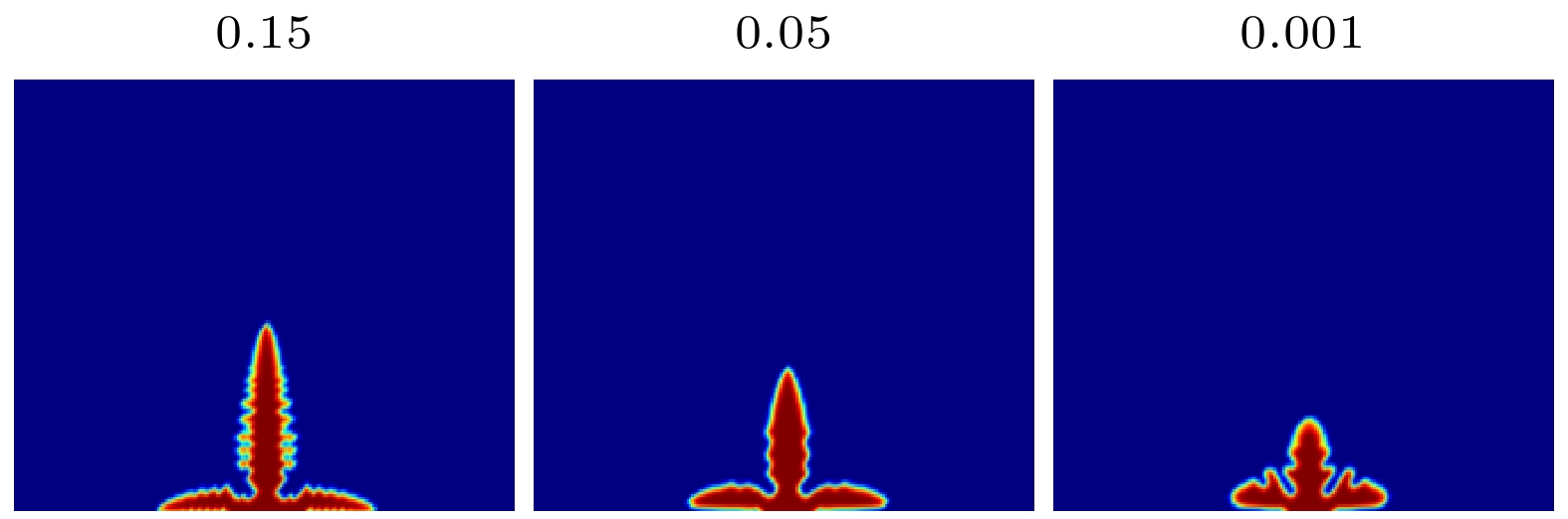 Fig. 1. Growth of lithium dendrites under different phase field models: (a) Lithium dendrite morphology of uncoupled heat transfer model; (b) lithium dendrite morphology of coupled heat transfer model; (c) von Mises stress for uncoupled heat transfer model (in MPa); (d) von Mises stress coupled to the heat transfer model (in MPa).