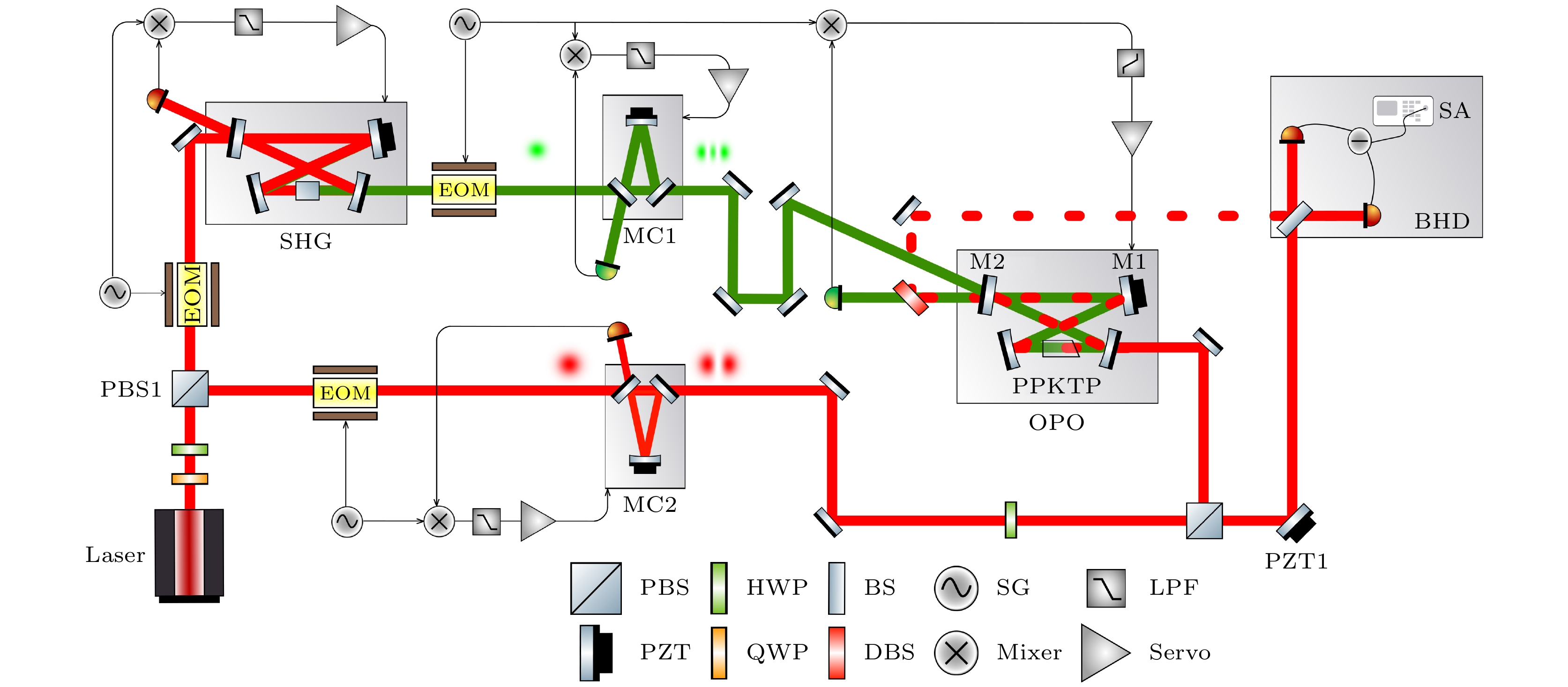 图 2 生成$ {\rm H{G_{00}}} $和$ \mathrm{HG_{10}}^{ } $模式压缩光的实验装置图 (QWP, 1/4波片; HWP, 半波片; PBS, 偏振分光棱镜; SG, 信号发生器; LPF, 低通滤波器; PZT, 压电陶瓷; DBS, 双色镜; BS, 50/50分束镜; SHG, 倍频腔; MC, 模式转换腔; OPO, 光学参量振荡器; SA, 频谱分析仪; BHD, 平衡零拍探测系统)