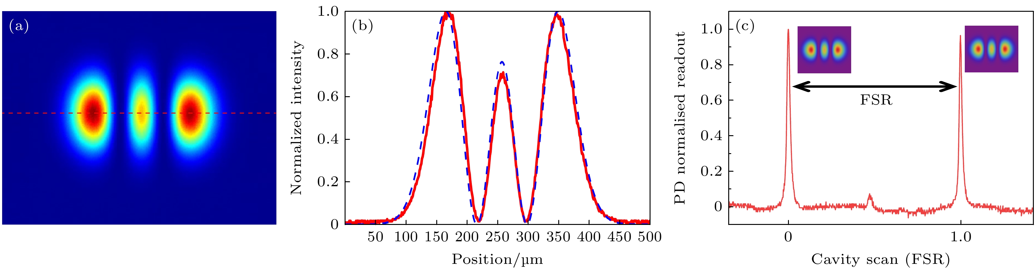 图 3 (a) $ {\rm H{G_{20}}} $模式强度分布; (b) $ {\rm H{G_{20}}} $模式的纯度拟合结果; (c) $ {\rm H{G_{20}}} $模式的透射光强随OPO腔长的变化结果, 0和1(FSR)对应于$ {\rm H{G_{20}}} $模式的透射峰