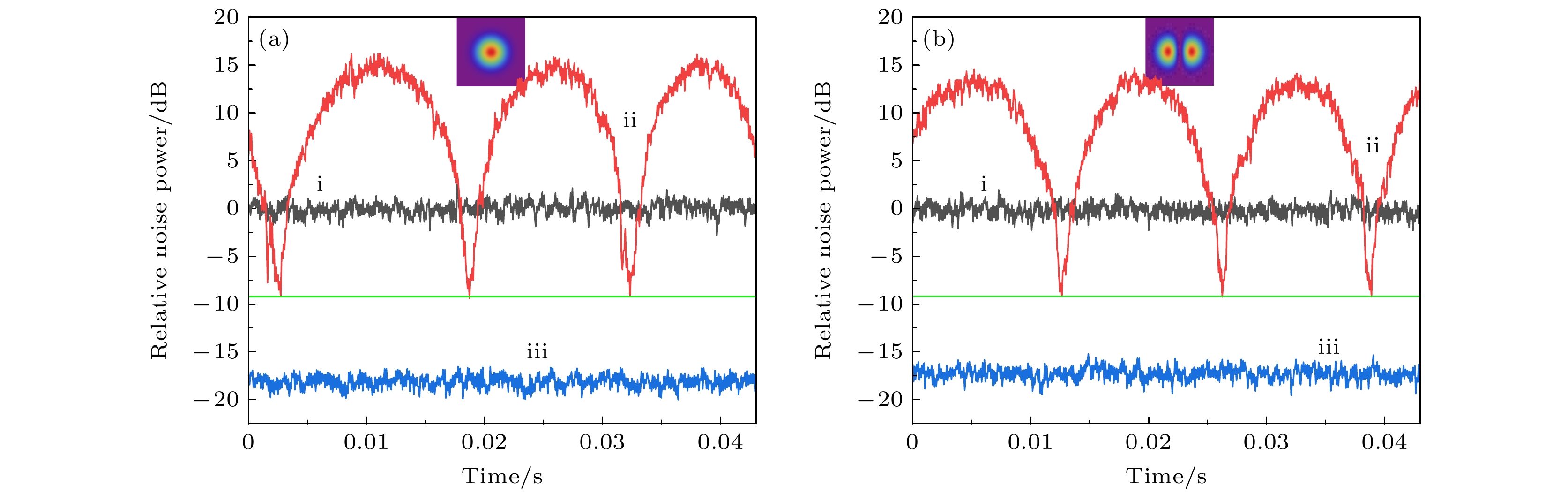 图 4 $ {\rm H{G_{00}}} $模式和$ {\rm H{G_{10}}} $模式压缩态光场的噪声功率谱 (a) $ {\rm H{G_{00}}} $模式的最大压缩度及其对应的反压缩度; (b) $ {\rm H{G_{10}}} $模式的最大压缩度及其对应的反压缩度; 曲线i为散粒噪声基准(SNL); 曲线ii为压缩态光场的量子噪声水平随本地光相位扫描的变化结果; 曲线iii为电子学噪声; 频谱分析仪的分辨率带宽(RBW)为300 kHz, 视频带宽(VBW)为2 kHz, 分析频率为3 MHz