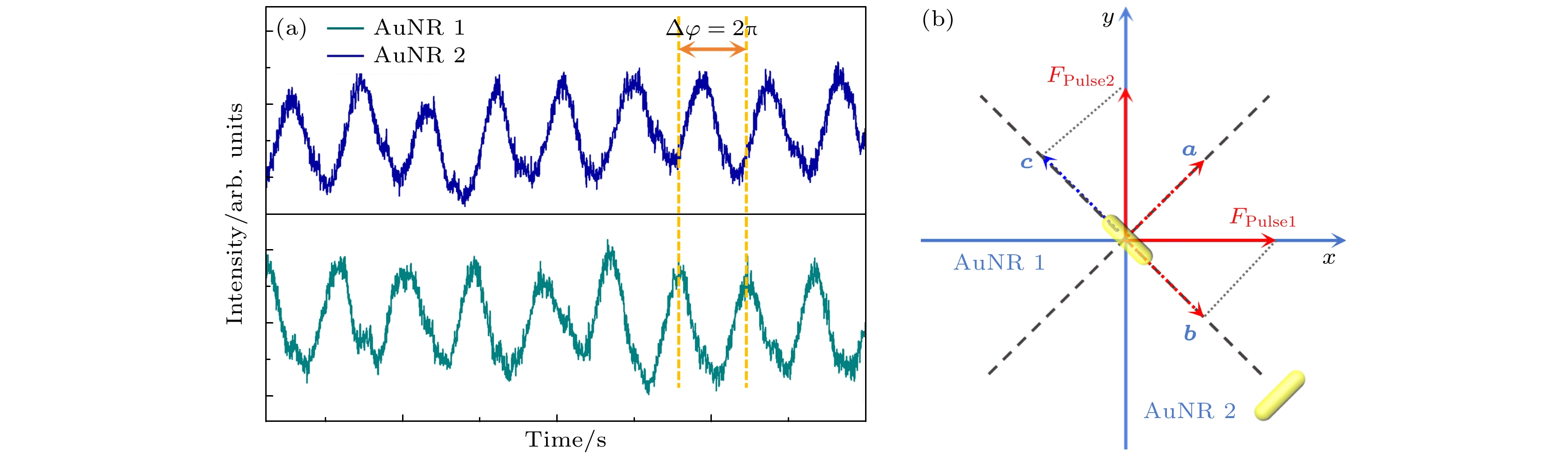 图 3 振幅投影示意图 (a) 以0.5 Hz的频率调制Pulse 1和Pluse 2之间的相对相位, AuNR 1和AuNR 2的TPPL强度具有相反的相位响应特征; (b) Pulse 1和Pluse 2的电场矢量方向分别沿x方向和y方向, 它们在平行于AuNR 1轴线上的投影为b和c, 垂直于轴线的投影为a, AuNR 2则不同