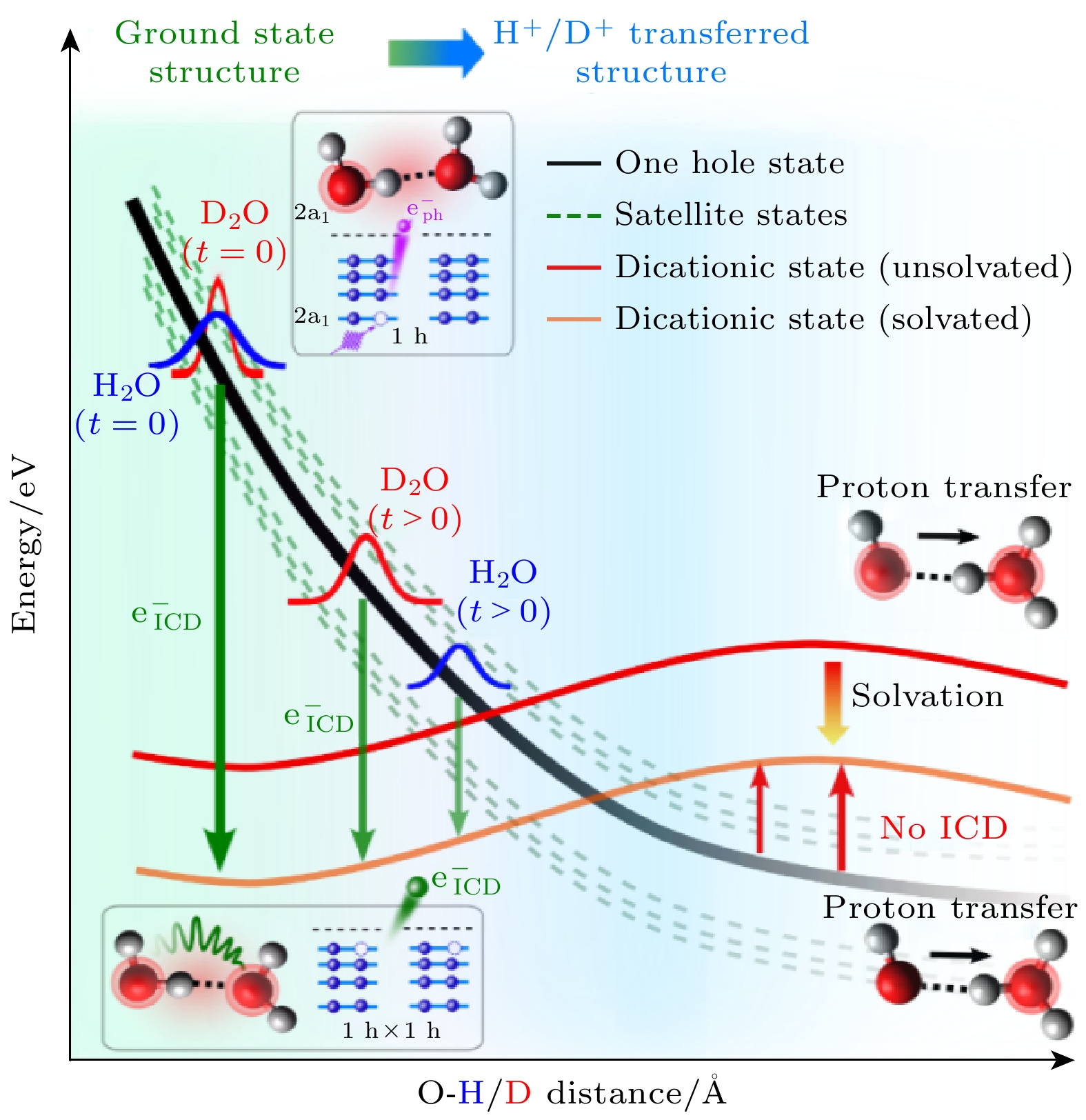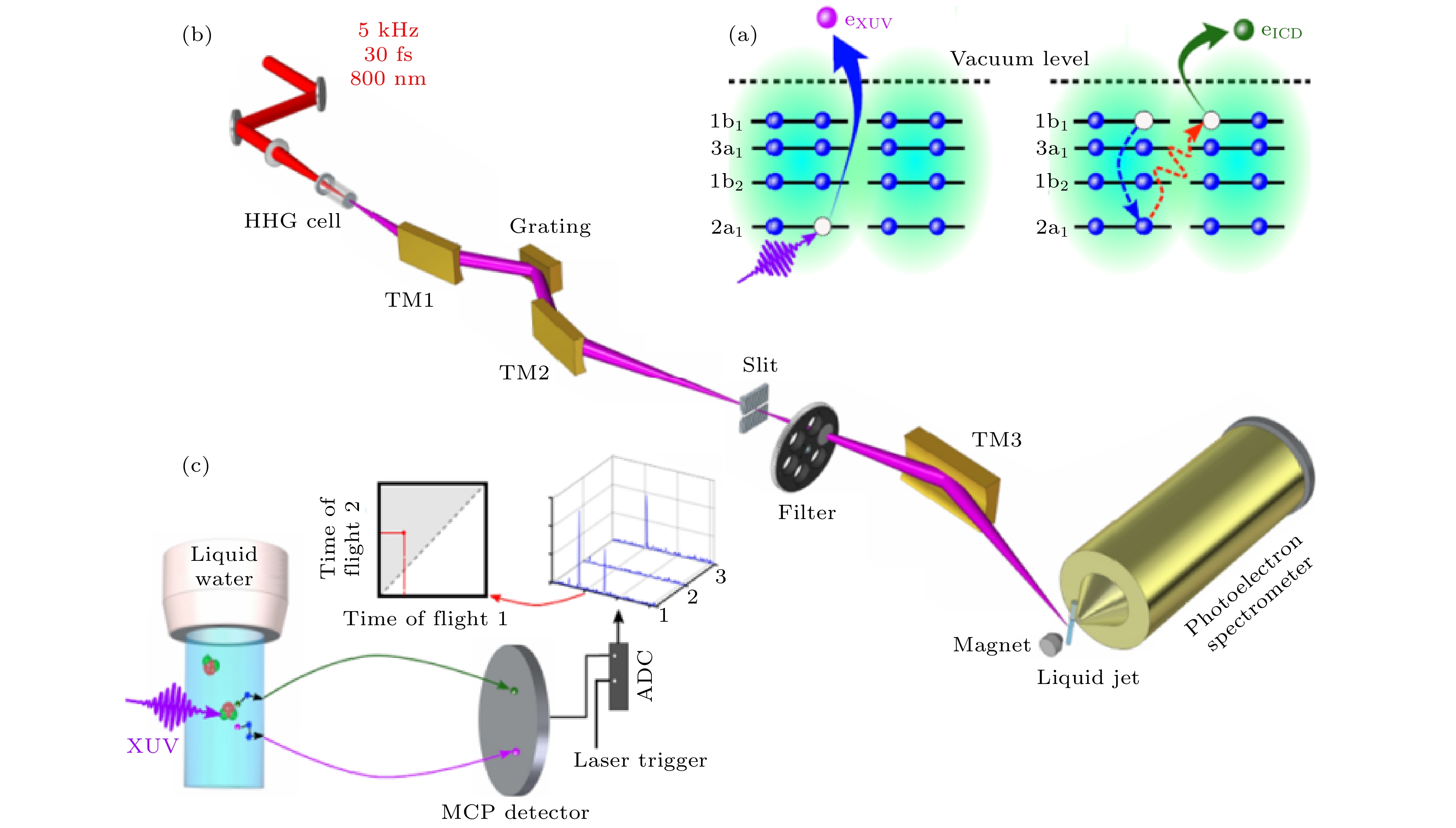 Fig. 11. (a) Schematic representation of the ICD process initiated by inner-valence ionization of 2a1 orbital in water dimer. The inner-valence vacancy is created by the absorption of an XUV photon; an outer-valence electron fills up the inner-valence vacancy via releasing the extra energy to the neighboring water molecule causing a further ionization in its outer-valence orbital; (b) the experimental setup for the photoelectron measurement; (c) schematic diagram of data acquisition and analysis, reproduced with permission from Ref. [64].