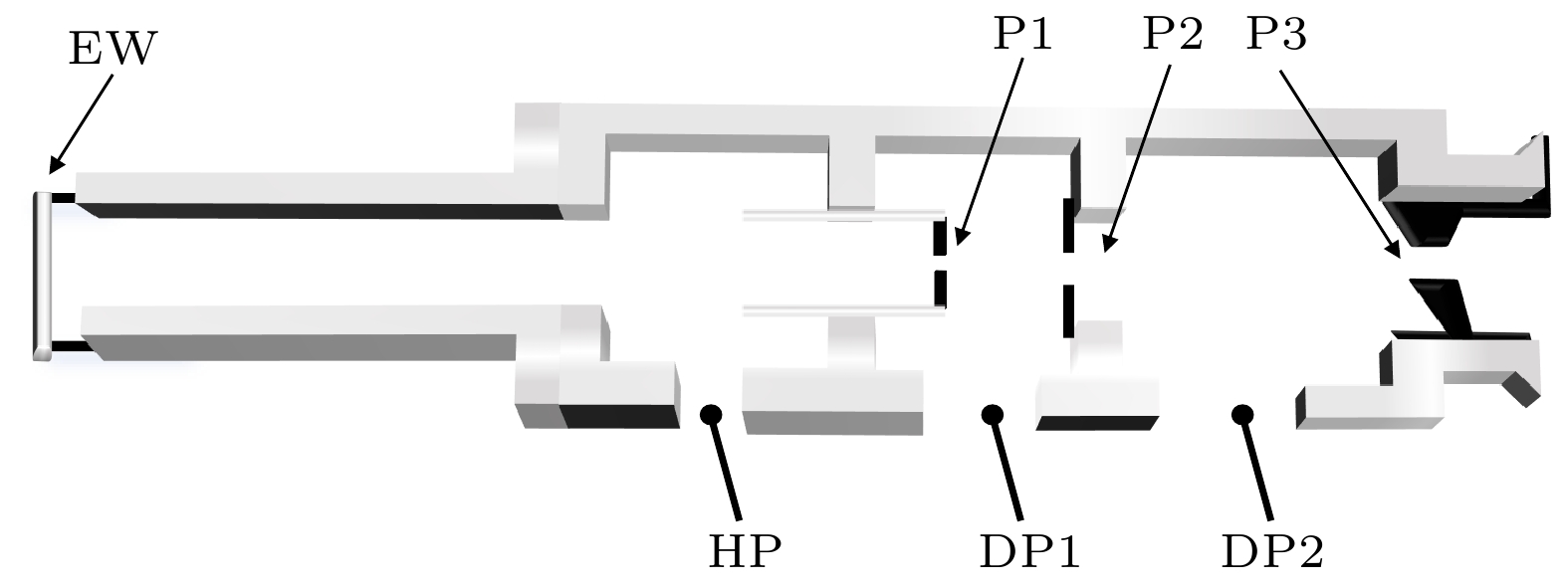 Fig. 6. Schematic diagram of the high-harmonic generation gas cell. The fundamental beam is focused through the entrance window EW such that the focus is located close to pinhole P1. The high-pressure region HP is separated from the experiment by two differential pumping stages DP1 and DP2. The corresponding pinholes are P2 and P3.