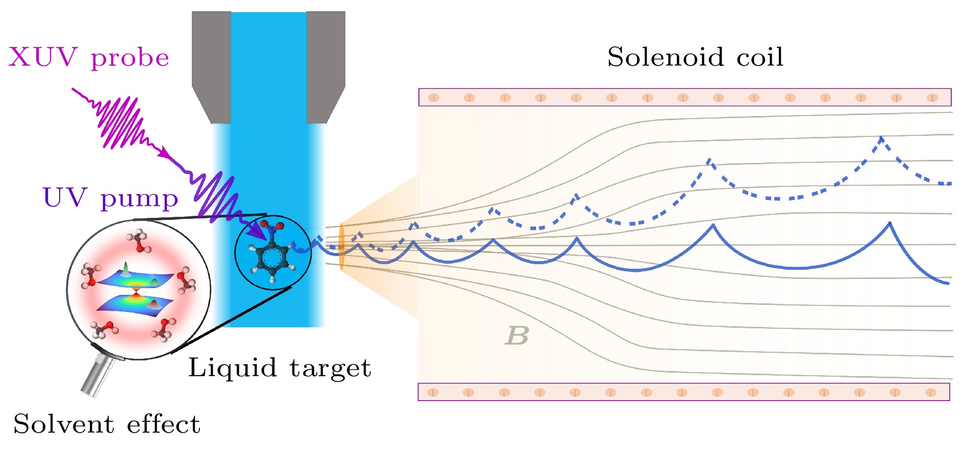 液相是化学和生物反应的关键环境, 由于溶剂化效应的存在, 液相分子的化学、生物反应动力学表现出显著区别于气相孤立分子的演化行为. 深入地研究液相分子的超快激发态动力学对于揭示复杂化学和生物过程的微观机制具有重要意义. 分子激发态的制备与演化通常发生在阿秒至皮秒的时间尺度, 光电子能谱不仅能够表征激发态分子的电子结构, 对分子构型的演化也很敏感, 被广泛用来研究激发态分子的超快动力学过程. 磁瓶式光电子谱仪、液体微束装置与高次谐波技术的结合, 可以在高真空条件下直接测量出射电子的能量分布及动力学演化信息, 是液相光电子能谱研究的核心手段. 本文系统地总结了该技术在液相超快动力学研究领域的最新进展, 详细地介绍了磁瓶式谱仪的基本工作原理、液体微束靶的制备方法; 讨论了其在生物分子激发态动力学演化、液相分子激发态非绝热过程、分子间库仑衰变和芳香族化合物水溶液的气-液界面性质等研究中的典型应用; 最后对技术瓶颈以及未来发展方向进行了探讨.The liquid phase serves as a critical environment for chemical and biological reactions. The chemical and biological reaction dynamics of molecules in liquids exhibit evolution behaviors that are significantly different from those of isolated molecules in the gas phase. The in-depth investigation of the ultrafast excited-state dynamics of liquid-phase molecules is of great importance for uncovering the microscopic mechanisms underlying complex chemical and biological processes. Photoelectron spectroscopy not only reveals the electronic structure of excited-state molecules but also exhibits high sensitivity to structural changes, making it a powerful tool for studying the relaxation dynamics. Liquid-phase time-resolved photoelectron spectroscopy utilizes a liquid microjet within a high vacuum. In this pump-probe technique, an initial pump pulse excites the liquids to initiate dynamics, followed by a delayed probe pulse that ionizes the evolving system. The time-dependent energy distribution of the resulting photoelectrons, which encodes the ultrafast dynamics, is measured by a magnetic-bottle time-of-flight (MB-TOF) analyzer. This review systematically summarizes recent advancements in the time-resolved liquid-phase photoelectron spectroscopy technology for studying ultrafast dynamics in liquids, detailing the fundamental working principles of magnetic-bottle spectrometers and the preparation techniques for liquid microjet targets. Furthermore, typical applications are discussed, concluding with an analysis of current technical challenges and future research directions.