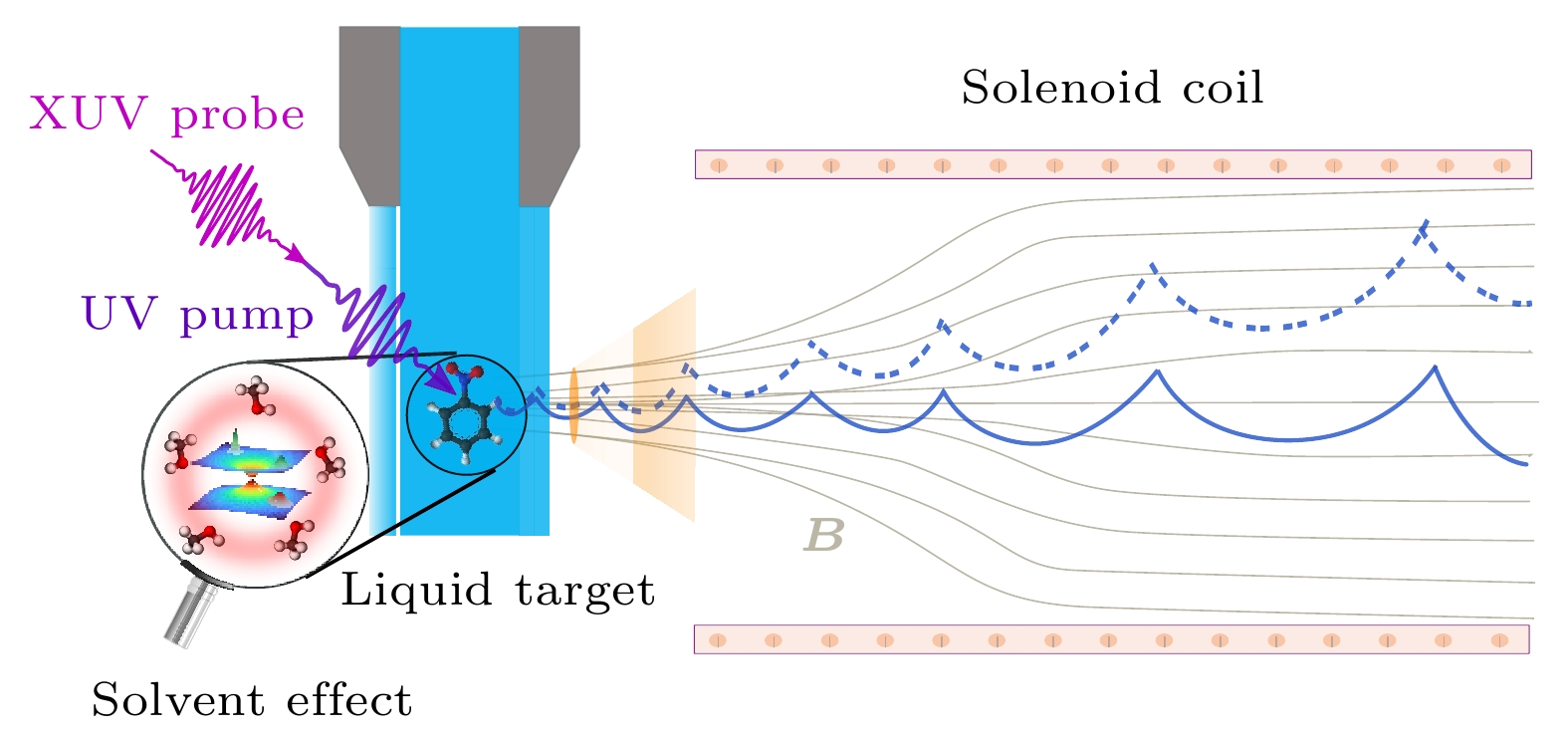 液相是化学和生物反应的关键环境, 由于溶剂化效应的存在, 液相分子的化学、生物反应动力学表现出显著区别于气相孤立分子的演化行为. 深入地研究液相分子的超快激发态动力学对于揭示复杂化学和生物过程的微观机制具有重要意义. 分子激发态的制备与演化通常发生在阿秒至皮秒的时间尺度, 光电子能谱不仅能够表征激发态分子的电子结构, 对分子构型的演化也很敏感, 被广泛用来研究激发态分子的超快动力学过程. 磁瓶式光电子谱仪、液体微束装置与高次谐波技术的结合, 可以在高真空条件下直接测量出射电子的能量分布及动力学演化信息, 是液相光电子能谱研究的核心手段. 本文系统地总结了该技术在液相超快动力学研究领域的最新进展, 详细地介绍了磁瓶式谱仪的基本工作原理、液体微束靶的制备方法; 讨论了其在生物分子激发态动力学演化、液相分子激发态非绝热过程、分子间库仑衰变和芳香族化合物水溶液的气-液界面性质等研究中的典型应用; 最后对技术瓶颈以及未来发展方向进行了探讨.The liquid phase serves as a critical environment for chemical and biological reactions. The chemical and biological reaction dynamics of molecules in liquids exhibit evolution behaviors that are significantly different from those of isolated molecules in the gas phase. The in-depth investigation of the ultrafast excited-state dynamics of liquid-phase molecules is of great importance for uncovering the microscopic mechanisms underlying complex chemical and biological processes. Photoelectron spectroscopy not only reveals the electronic structure of excited-state molecules but also exhibits high sensitivity to structural changes, making it a powerful tool for studying the relaxation dynamics. Liquid-phase time-resolved photoelectron spectroscopy utilizes a liquid microjet within a high vacuum. In this pump-probe technique, an initial pump pulse excites the liquids to initiate dynamics, followed by a delayed probe pulse that ionizes the evolving system. The time-dependent energy distribution of the resulting photoelectrons, which encodes the ultrafast dynamics, is measured by a magnetic-bottle time-of-flight (TOF) analyzer. This review systematically summarizes recent advancements in the time-resolved liquid-phase photoelectron spectroscopy technology for studying ultrafast dynamics in liquids, detailing the fundamental working principles of magnetic-bottle spectrometers and the preparation techniques for liquid microjet targets. Furthermore, typical applications are discussed, concluding with an analysis of current technical challenges and future research directions.