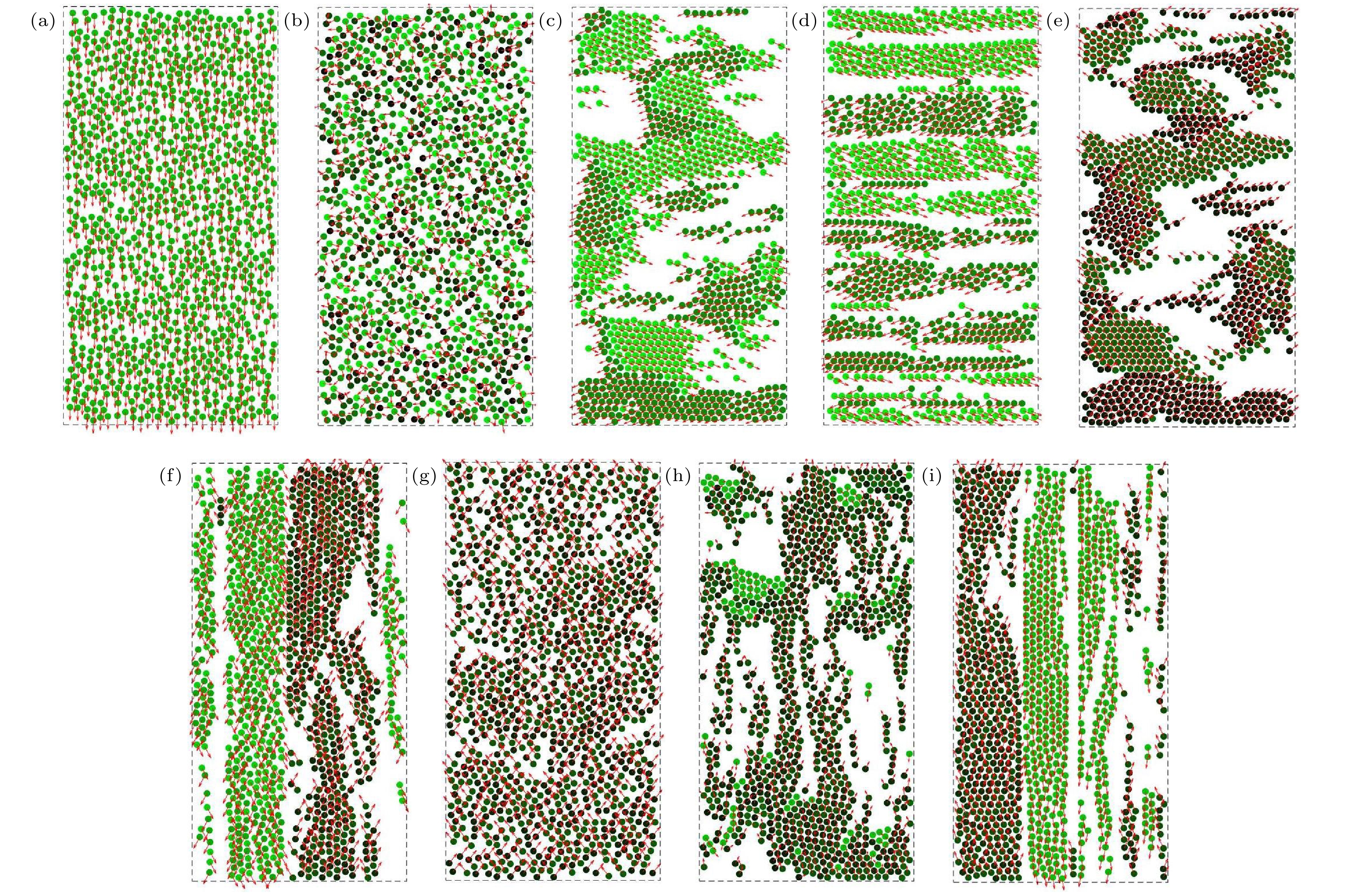 图 1 周期交流场驱动惯性活性粒子在周期边界中运动粒子快照图 (a) $ \omega =0.01 $; (b) $ \omega =10 $; (c) $ \omega =13 $; (d) $ \omega =14 $; (e) $ \omega = $$ 15 $; (f) $ \omega =16 $; (g) $ \omega =33 $; (h) $ \omega =46 $; (i) $ \omega =50 $; 其他参数设置为: $ I=3000,\; \varepsilon =1.0,\; {D}_{\mathrm{r}}=0.01 $和${{v}}_{0}=1.0 $. 其中, 用粒子填充颜色区分粒子在竖直方向的运动方向, 黑色表示$ {v}_{y} > 0 $, 绿色表示$ {v}_{y} < 0 $, 红色箭头表示粒子运动方向