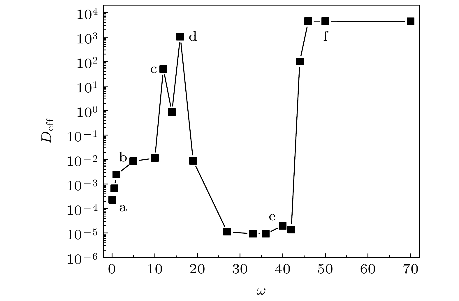 图 2 系统有效扩散系数$ {D}_{\mathrm{e}\mathrm{f}\mathrm{f}} $随周期交流场频率$ \omega $的变化. 其他参数设置为$ {I}=3000,\; \varepsilon=1.0,\; {D}_{\mathrm{r}}=0.01 $和${{v}}_{0}=1.0 $. 图中a, b, c, d, e及f点的状态分别对应图1(a)、图1(b)、图1(d)、图1(f)、图1(h)、图1(j)