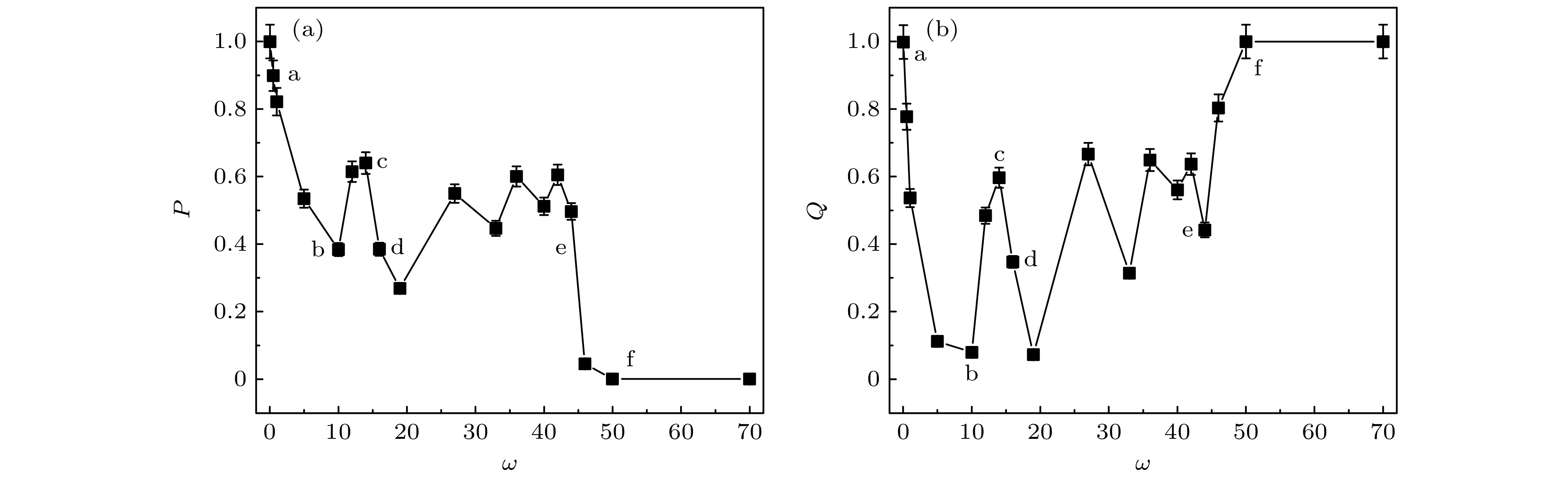 Fig. 3. (a) Variation of the system polarity order parameter P with AC field frequency $ \omega $; (b) variation of the vectorial order parameter $ Q $ with the AC field frequency $ \omega $. Other parameters are set to $ {I}= 3000,\; { \varepsilon }= 1.0,\; {{D}}_{\text{r}}= $$ 0.01, $ and ${{v}}_{0}=1.0. $ The states at points a, b, c, d, e and f in the figure correspond to Fig. 1(a), Fig. 1(b), Fig. 1(d), Fig. 1(f), Fig. 1(h) and Fig. 1(j), respectively.