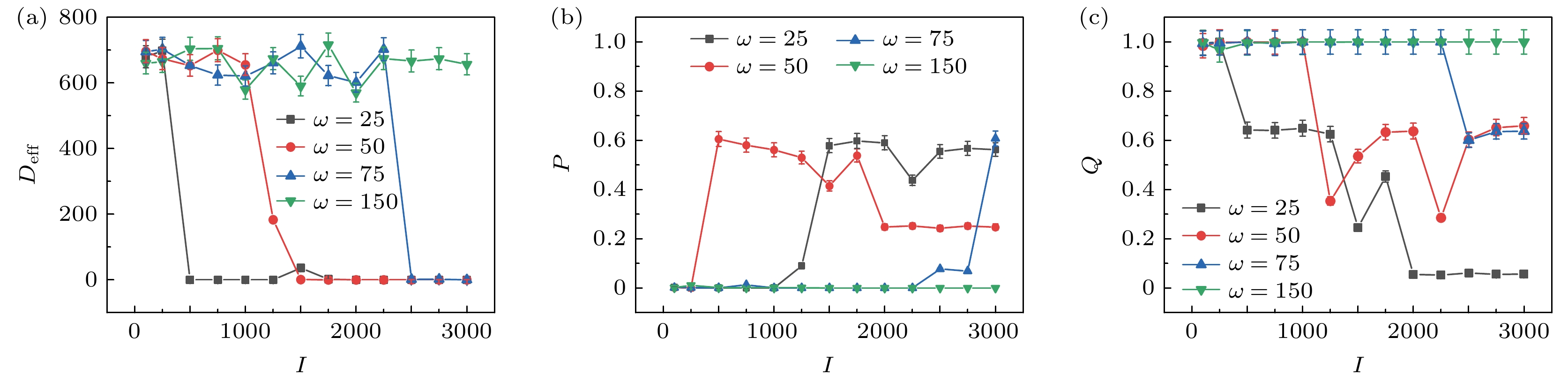 Fig. 4. (a) Variation of effective diffusion coefficient $ {{D}}_{\text{eff}} $ with AC field strength I for different $ \omega $; (b) variation of polarity order parameter P with AC field strength I for different $ \omega $; (c) variation of nematic order parameter $ Q $ with AC field strength $ I $ for different $ \omega $. The other parameters are set as $ { \varepsilon }= 1.0, \;{{D}}_{\text{r}}= 0.01, $ and ${{v}}_{0}= 1.0 $.