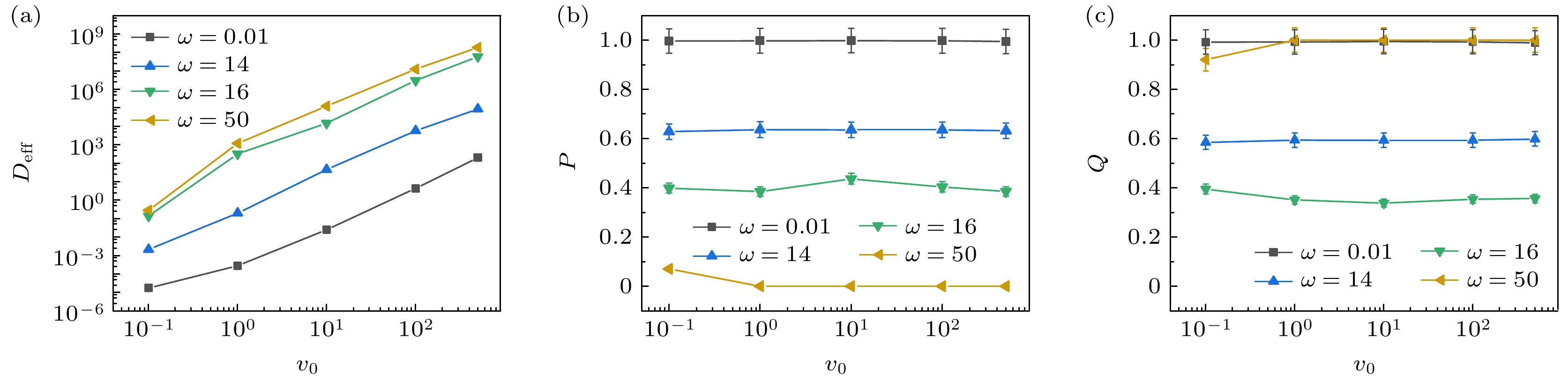图 5 (a) 在不同$ \omega $值下, 系统有效扩散系数$ {D}_{\mathrm{e}\mathrm{f}\mathrm{f}} $随粒子自驱动速度$ {v}_{0} $的影响; (b) 在不同$ \omega $值下, 系统极性序参量$ {P} $随粒子自驱动速度$ {v}_{0} $的变化; (c) 在不同$ \omega $值下, 系统向列序参量$ Q $随粒子自驱动速度$ {v}_{0} $的变化. 其他参数设置为: $ { \varepsilon }= 1.0, \;{{D}}_{\text{r}}= 0.01$和${I}= 3000 $