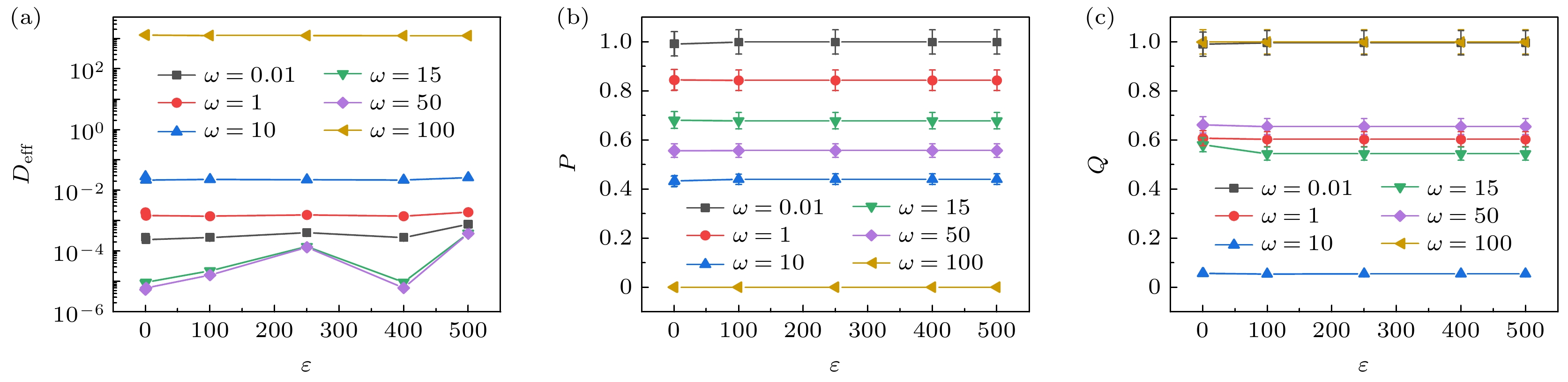 Fig. 6. (a) Variation of effective diffusion coefficient $ {D}_{\mathrm{e}\mathrm{f}\mathrm{f}} $ with interaction strength $ { \varepsilon } $ for different AC field frequencies $ \omega $; (b) variation of the system polar order parameter $Q $ with interaction strength $ { \varepsilon } $ for different AC field frequencies $ \omega $; (c) variation of the system nematic order parameter $ Q $ with interaction strength $ { \varepsilon } $ for different AC field frequencies $ \omega $. The other parameters are set as $ {I}=3000, \;{D}_{\mathrm{r}}=0.01, $ and ${{v}}_{0}=1.0 $.