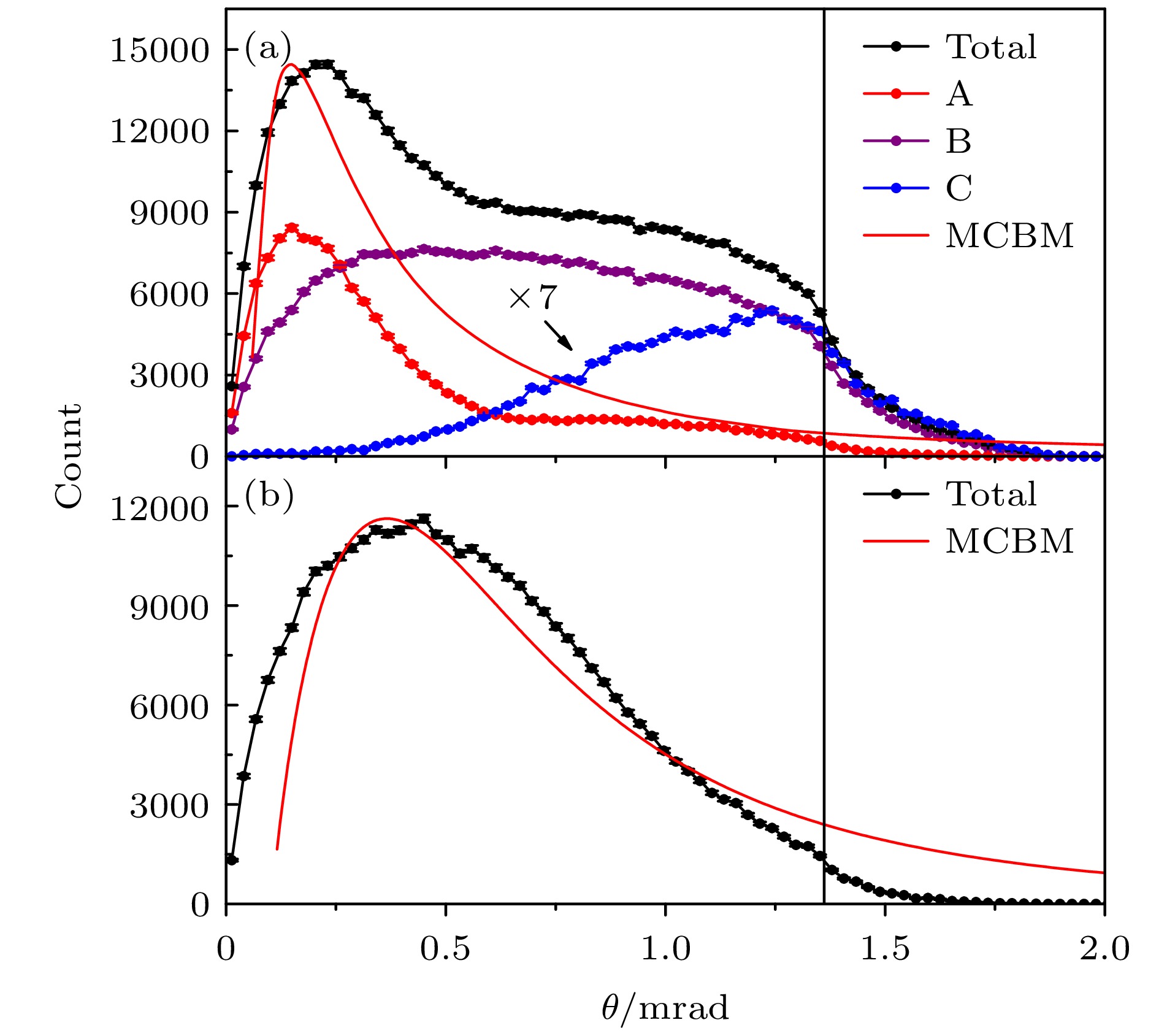 图 2 40 keV能量下Ar2+-Ar碰撞过程的单、双电子俘获的散射角分布. 红色实线表示MCBM计算的散射角分布. 黑色竖线为辅助线, 竖线右侧为未完全收集的部分