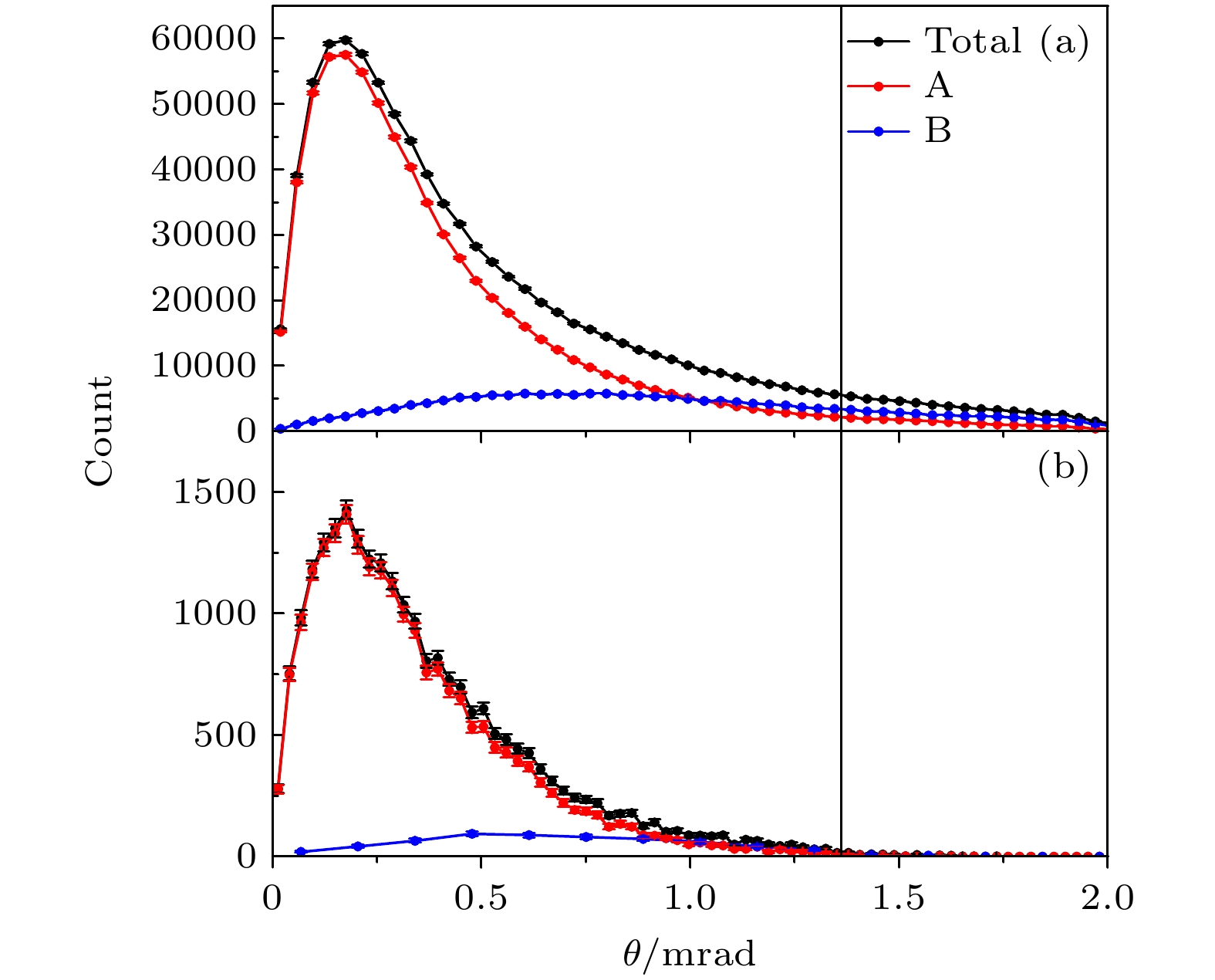 图 4 40 keV能量下Ar2+-N2碰撞过程的单、双电子俘获的散射角分布 (a)单电子俘获过程; (b)双电子俘获过程. 黑色竖线为辅助线, 竖线右侧为未完全收集的部分