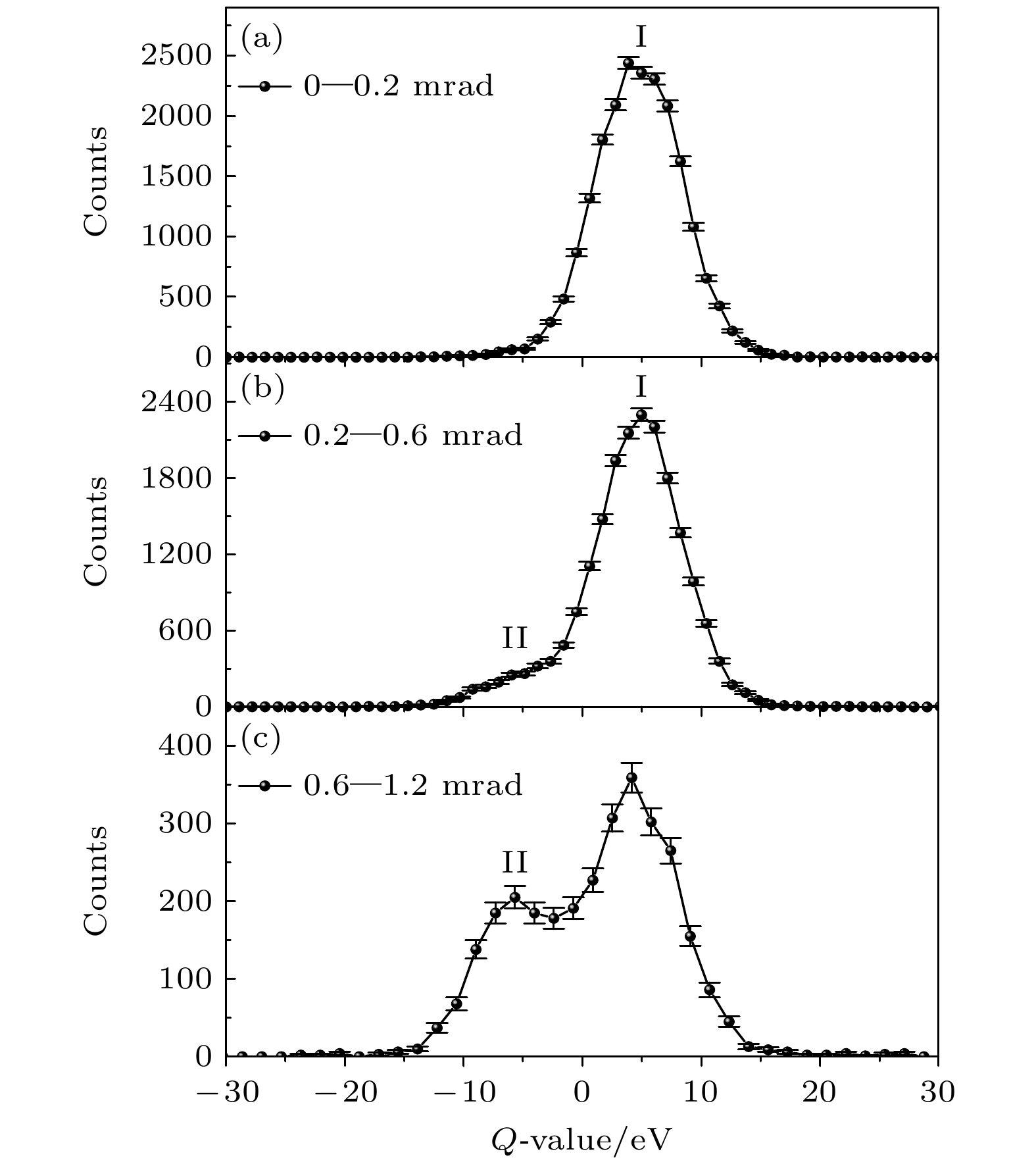 图 5 在40 keV能量下, Ar2+-N2碰撞过程不同散射角范围内双电子俘获的Q值谱, 其中过程 I: Ar2+(3s23p4 3P, 1D, 1S)+N2→Ar(1S)+$ \text{N}_{2}^{2+} $和过程II: Ar2+(3s23p4 3P, 1D, 1S)+N2→Ar(3s23p5nl )+$ \text{N}_{2}^{2+} $