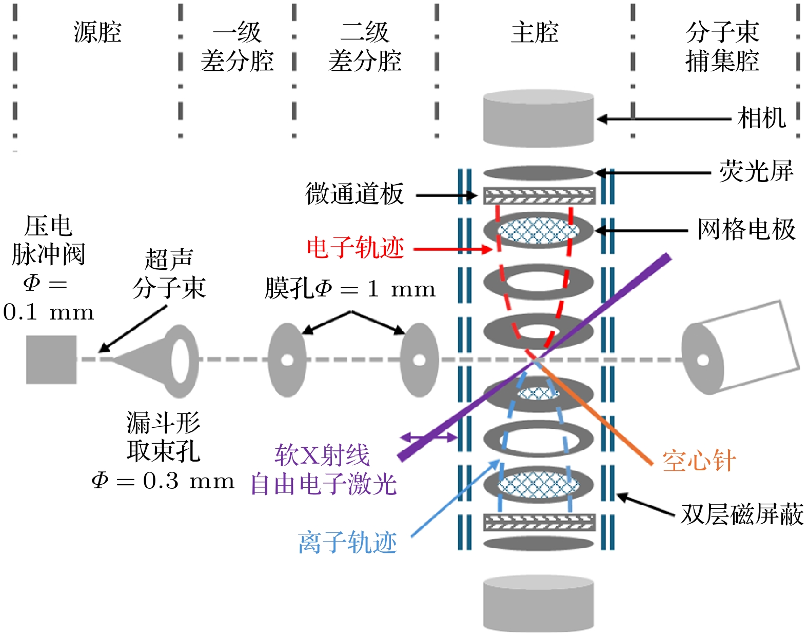 图 1 复合速度成像谱仪示意图, 其中气体样品通过超声分子束或者空心针注入主腔, 气体样品与光相互作用后, 产生的电子和离子在电场的引导下飞行到两端的荧光屏探测器, 利用相机记录实验图像
