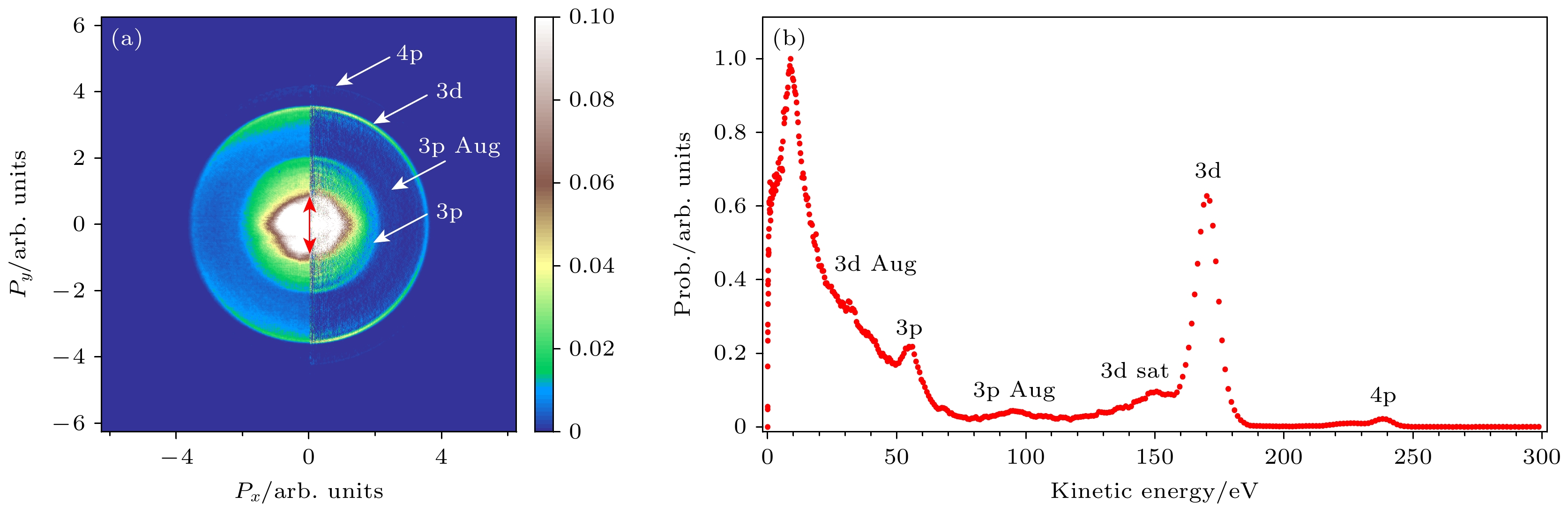 图 2 Kr的光电子图像 (a) 图像左半部分是原始图像, 右半部分是反阿贝尔变换后的动量谱, 中间红色的双箭头表示自由电子激光的极化方向; (b) 将动量谱全角度积分后得到的电子能谱