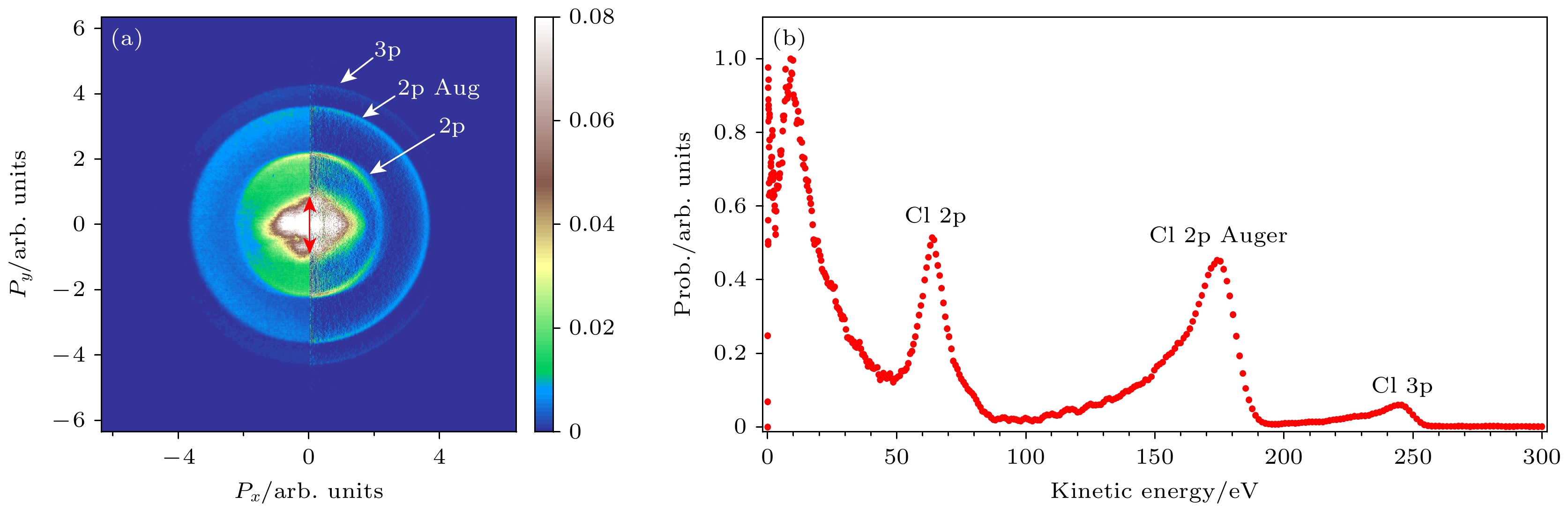 Fig. 4. Photoelectron images of CCl4: (a) The left half of the image is the raw image, and the right half is the momentum spectrum obtained after the inverse Abel transformation. The red double-headed arrow in the middle indicates the polarization direction of the free electron laser. (b) The electron energy spectrum obtained by integrating the momentum spectrum over all angles.