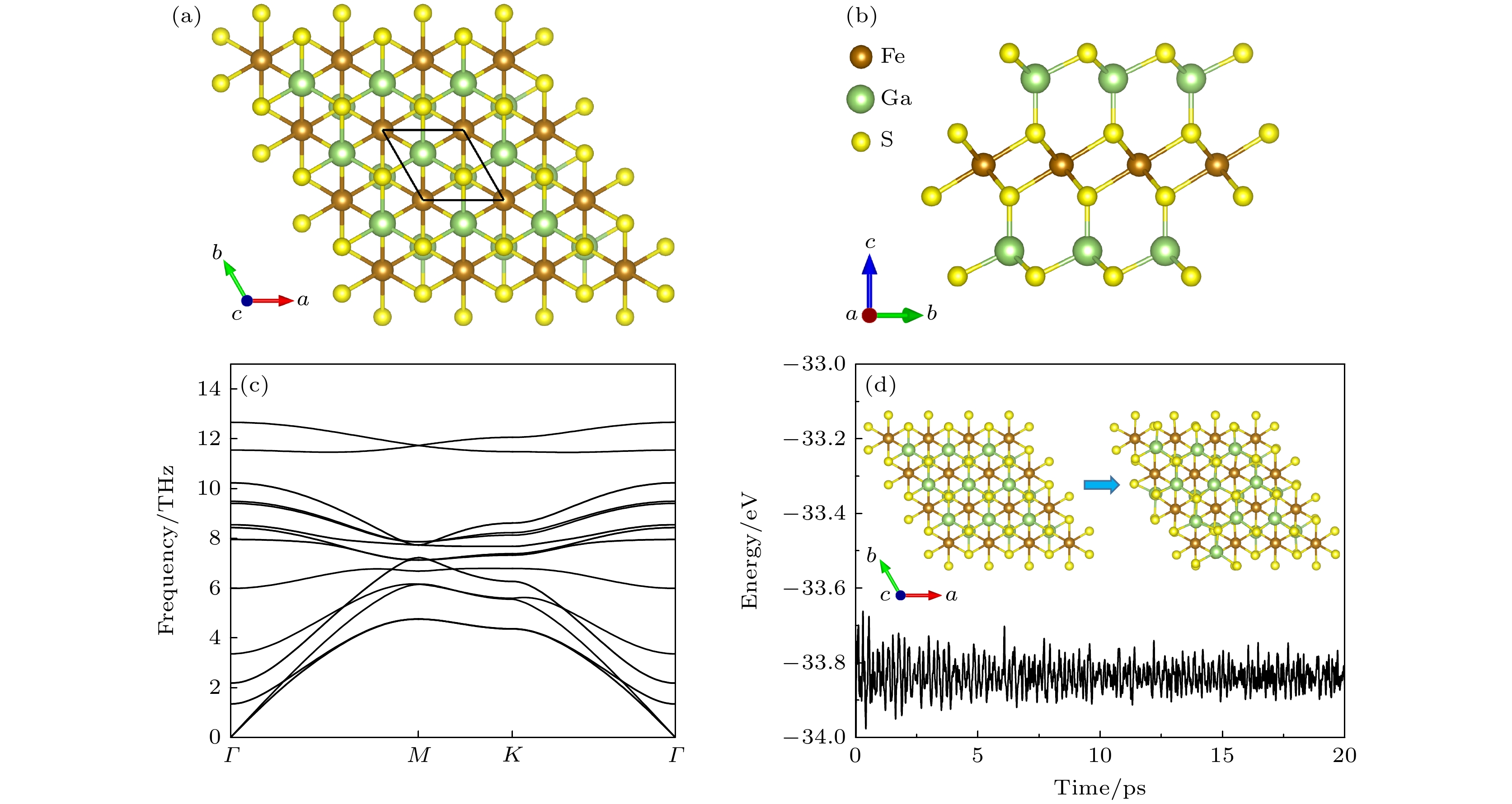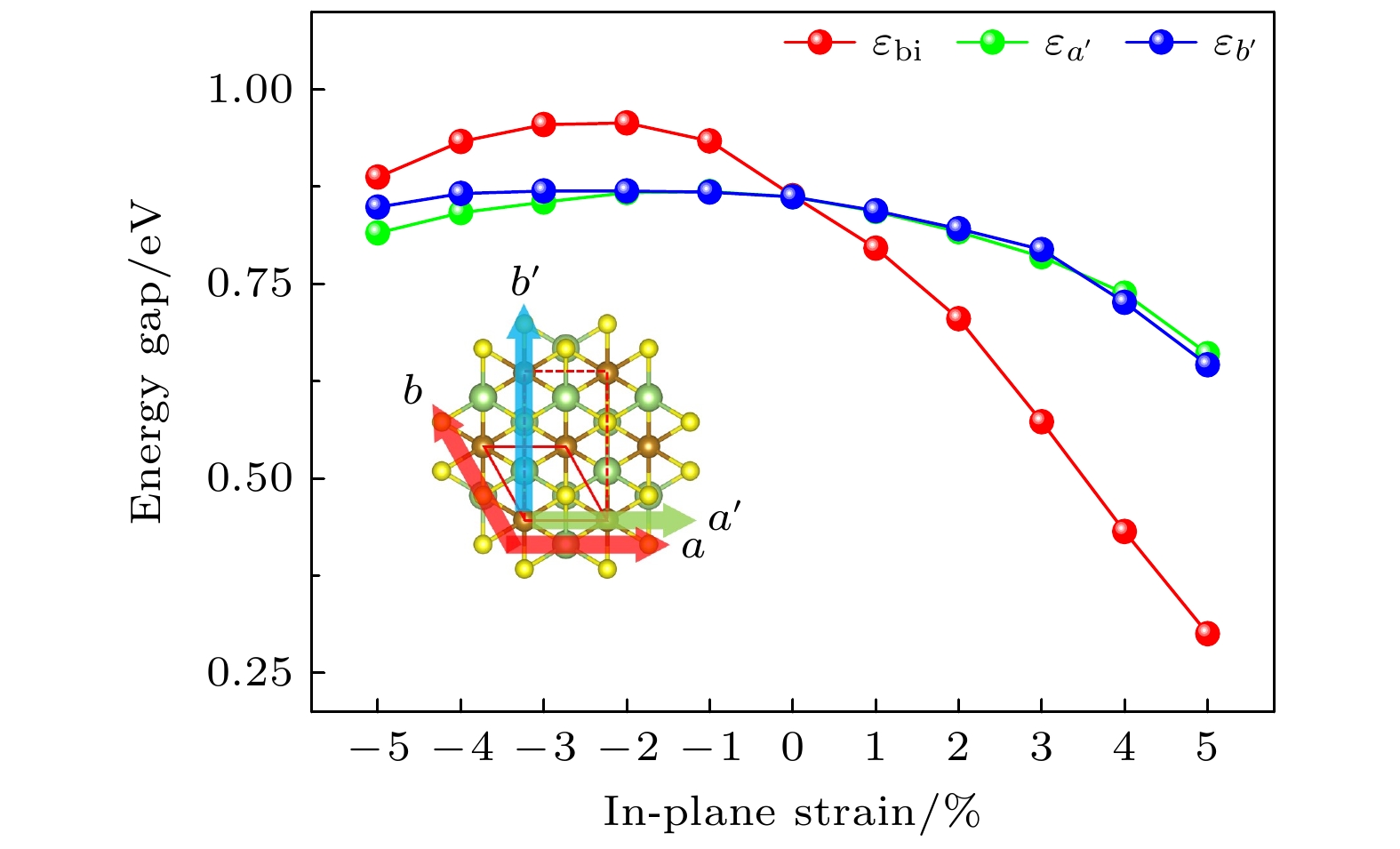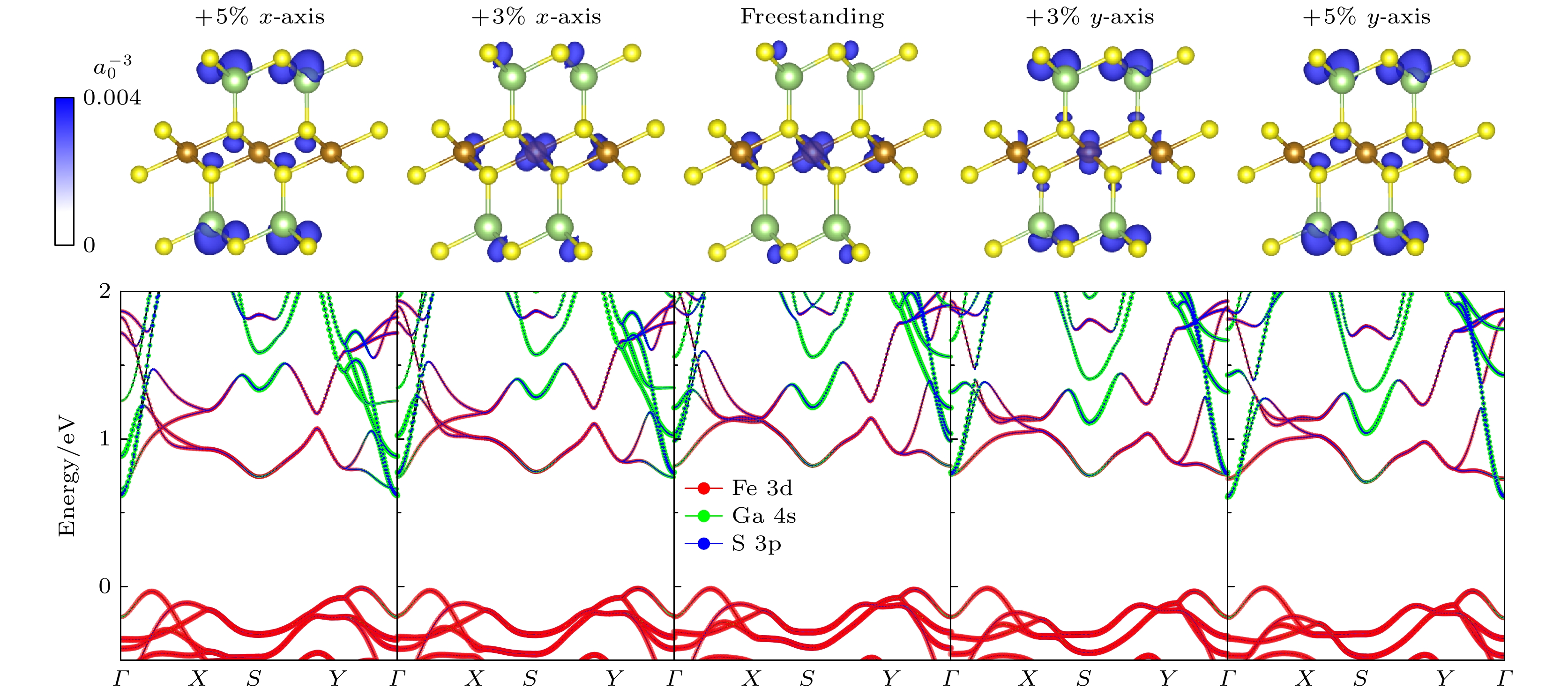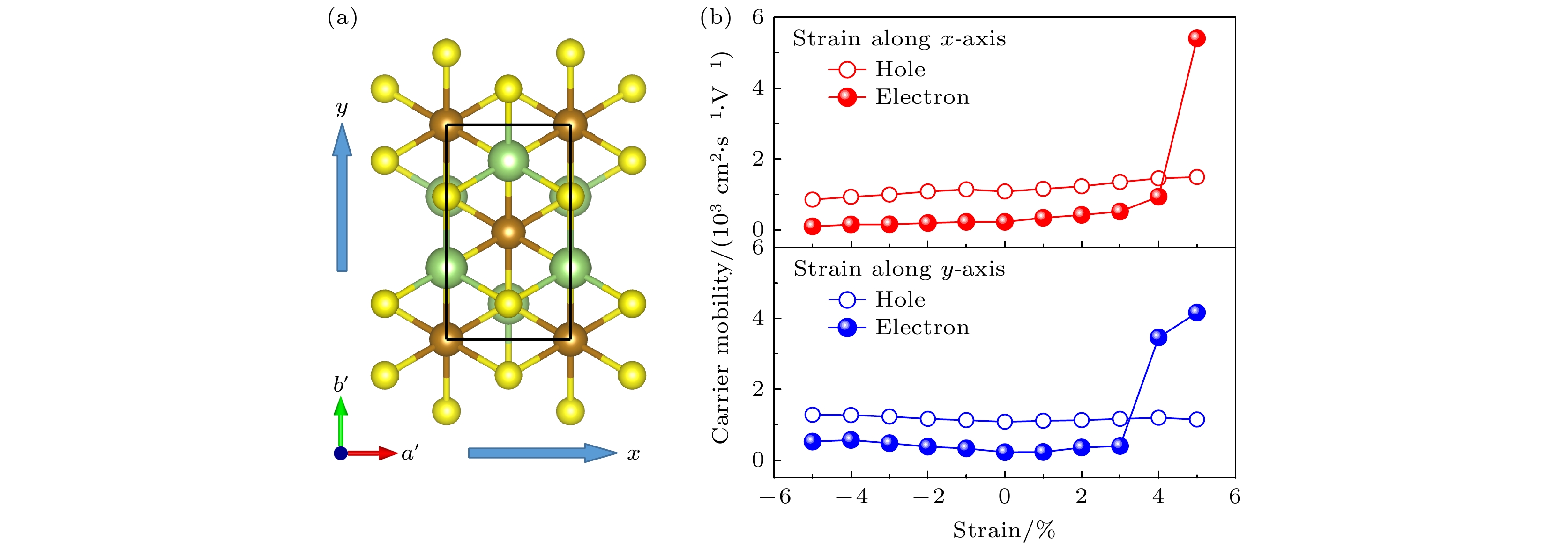 针对高速电子器件与光电器件的发展需求, 探索并设计具有优异载流子输运特性的二维半导体材料已成为该领域的核心科学问题. 本文基于密度泛函理论, 采用第一性原理计算系统地探究了面内应力对单层FeGa2S4材料输运性质及光学性质的调控规律. 结果表明, FeGa2S4易于剥离, 其单层结构具有较好的动力学、热力学稳定性和面内各向同性的机械性能, 较低的杨氏模量使其在外部应力下易于形变. 与母相块材相似, 单层FeGa2S4也是一种间接带隙半导体(能隙为1.65 eV), 在单轴应力(应变范围±5%)调控下, 空穴迁移率基本保持不变(约103 cm2·V−1·s–1), 电子迁移率(+5%应变)则提升超过一个数量级. 双轴拉伸应力则能够有效提升材料在可见光范围内的光捕获能力. 研究结果表明单层FeGa2S4在高速电子和柔性光电器件领域具有较大的应用前景.This study aims to explore two-dimensional semiconductor materials with superior carrier transport properties to meet the growing demands of high-speed electronics and optoelectronic devices, focusing on evaluating the feasibility of monolayer FeGa2S4 as a candidate material through systematic theoretical investigations. First-principles calculations are used to analyze the exfoliation energy of FeGa2S4 bulk crystal, as well as the structural stability, mechanical properties, and strain-dependent optoelectronic behavior of its monolayer counterpart. Strain engineering strategies, including uniaxial and biaxial strain, are used to assess carrier mobility modulation and spectral response. Our calculation results indicate that monolayer FeGa2S4 is an indirect bandgap semiconductor (Eg = 1.65 eV) with low stiffness (Young’s modulus up to 151.6 GPa) and high flexibility (Poisson’s ratio less than 0.25), demonstrating exceptional thermodynamic stability. Under +5% uniaxial tensile strain, its electron mobilities along x and y directions dramatically increases to 5402.4 cm2·V–1·s–1 and 4164.0 cm2·V–1·s–1, fivefold higher than its hole mobility. Biaxial strain outperforms uniaxial strain in bandgap modulation and induces a systematic redshift in optical spectra, significantly enhancing visible-light harvesting efficiency. This work reveals that monolayer FeGa2S4 is a promising high-mobility photoactive material for next-generation solar cells and optoelectronics. The strain-mediated control of electronic and optical properties provides a theoretical framework for optimizing 2D semiconductors and critical guidance for experimental synthesis and device engineering. These findings highlight the potential of materials in advancing energy conversion technology and photonic applications.