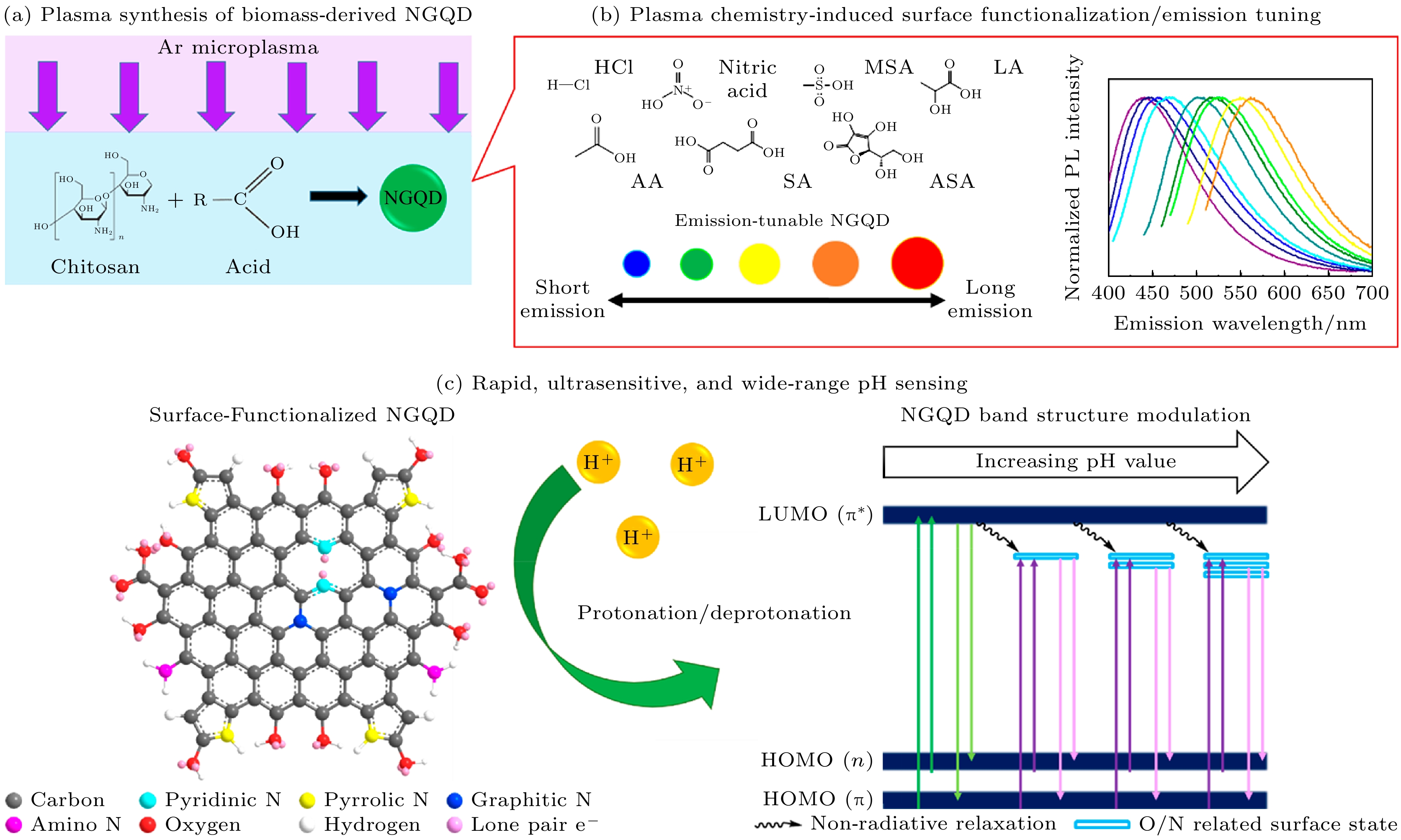 图 11 利用微等离子体合成技术, 通过调控表面功能化, 实现基于生物质壳聚糖的氮掺杂石墨烯量子点的合理设计, 用于快速、灵敏且宽范围的pH传感示意图, 经许可转载[42]