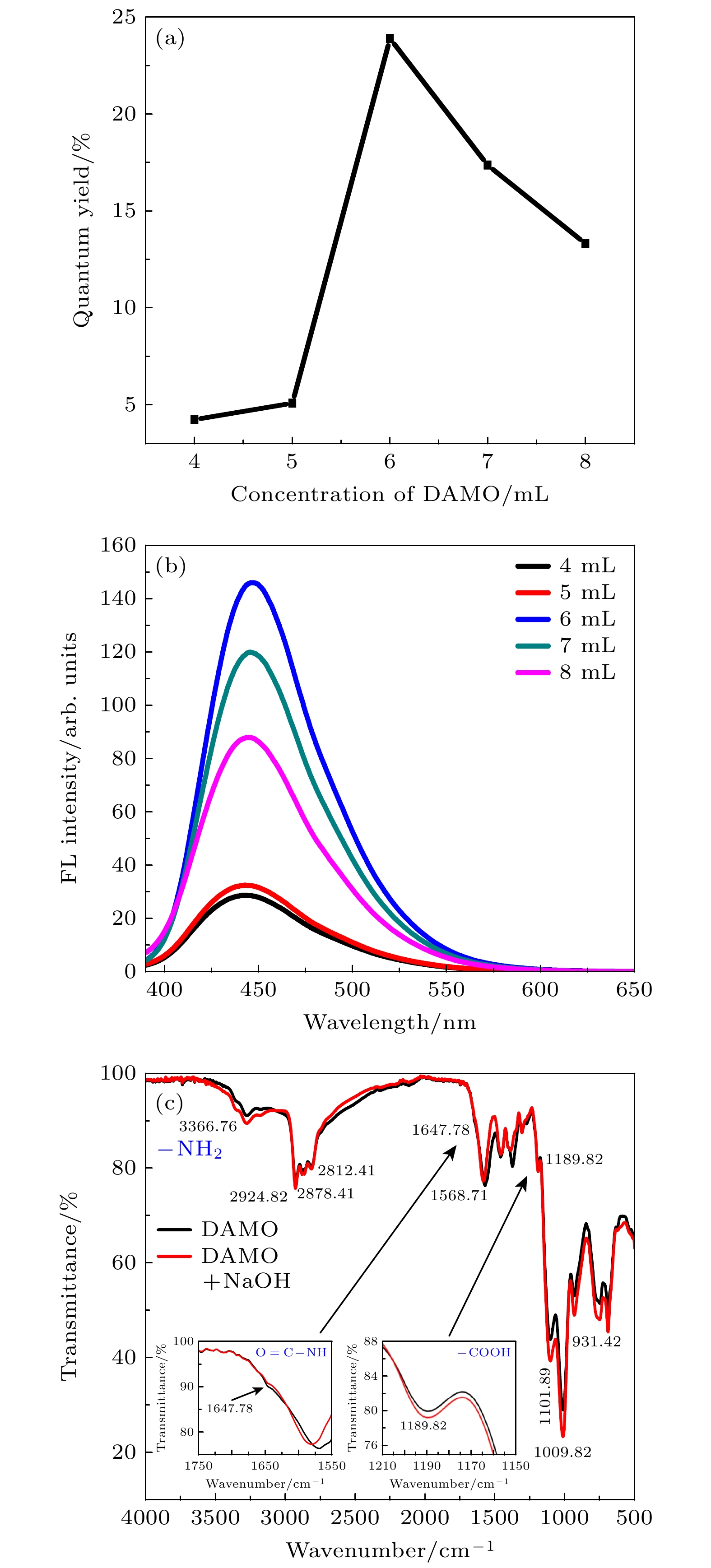 图 2 不同浓度DAMO对碳量子点的(a)荧光量子产率和(b)荧光光谱的影响; (c) 加入NaOH前后碳量子点样品的傅里叶变换红外光谱, 经许可转载[30]