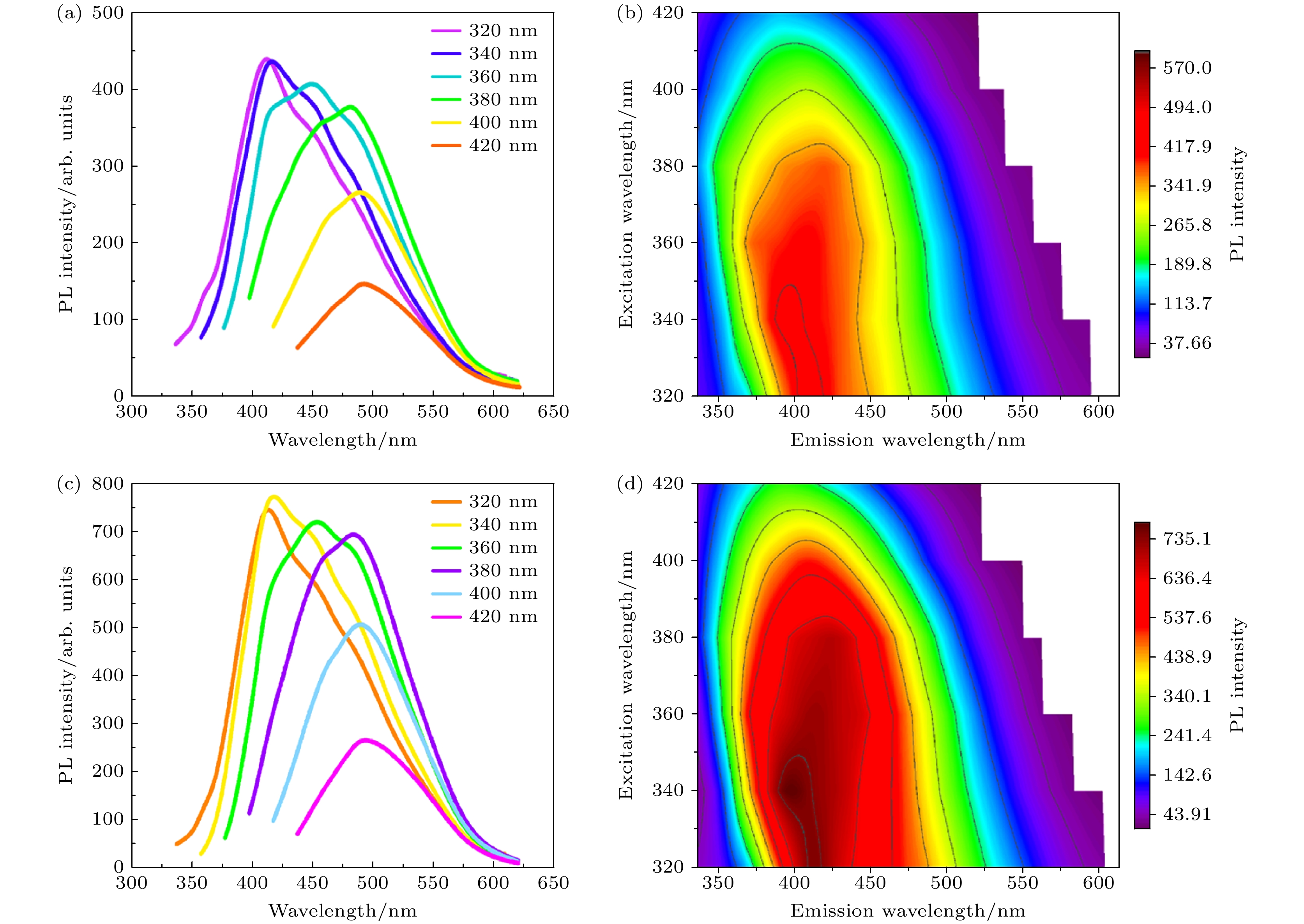 图 3 (a), (b) 等离子体处理30 min制备的氮掺杂碳量子点的光致发光光谱和二维激发-发射等高线图; (c), (d) 等离子体处理60 min制备的氮掺杂碳量子点的光致发光光谱和二维激发-发射等高线图, 经许可转载[32]