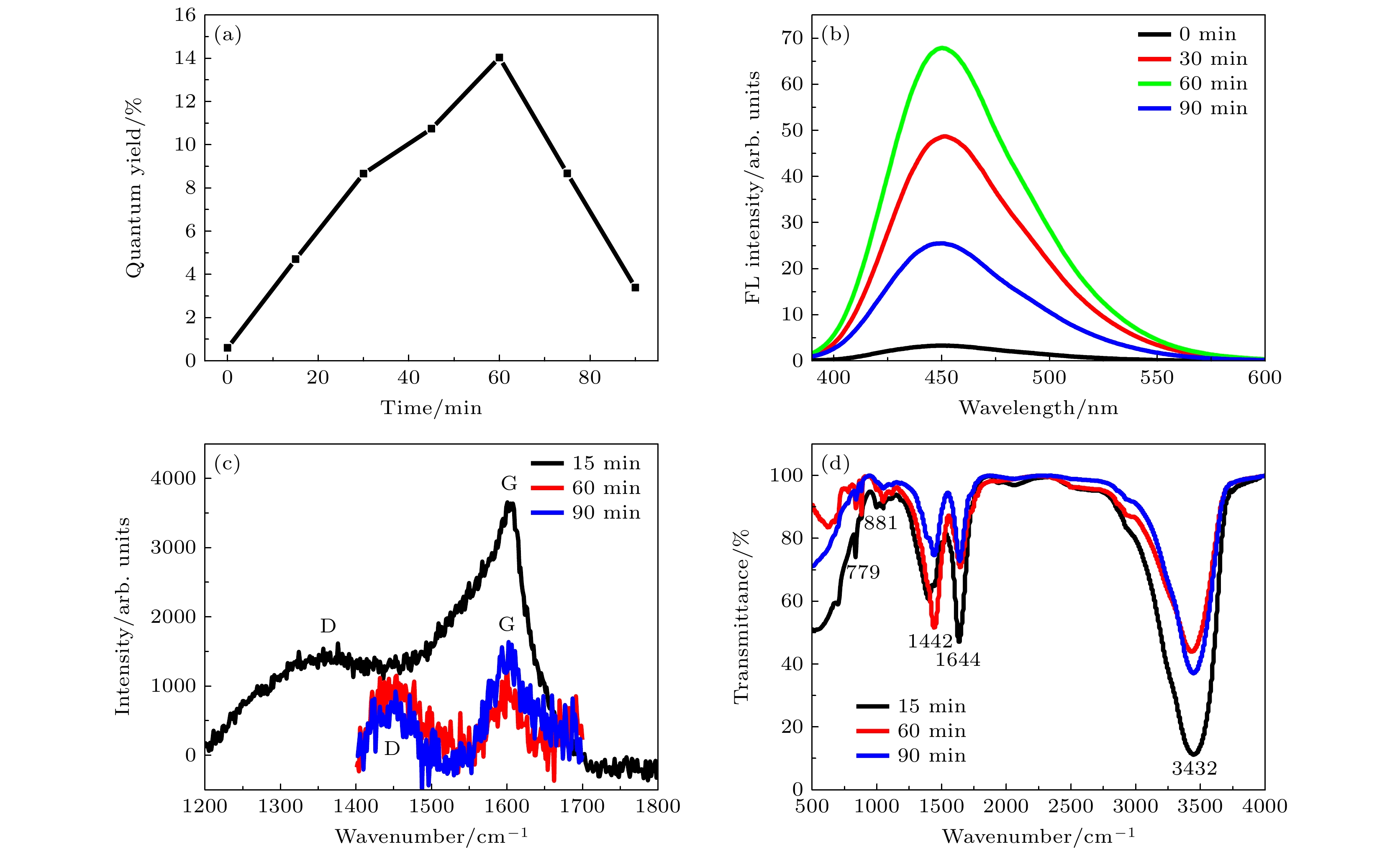 图 4 等离子体处理碳量子点的90 min在线测量的(a)荧光量子产率和(b)荧光光谱; 反应时间为15 min, 60 min和90 min制备的碳量子点的(c)拉曼光谱和(d)傅里叶变换红外光谱, 经许可转载[34]