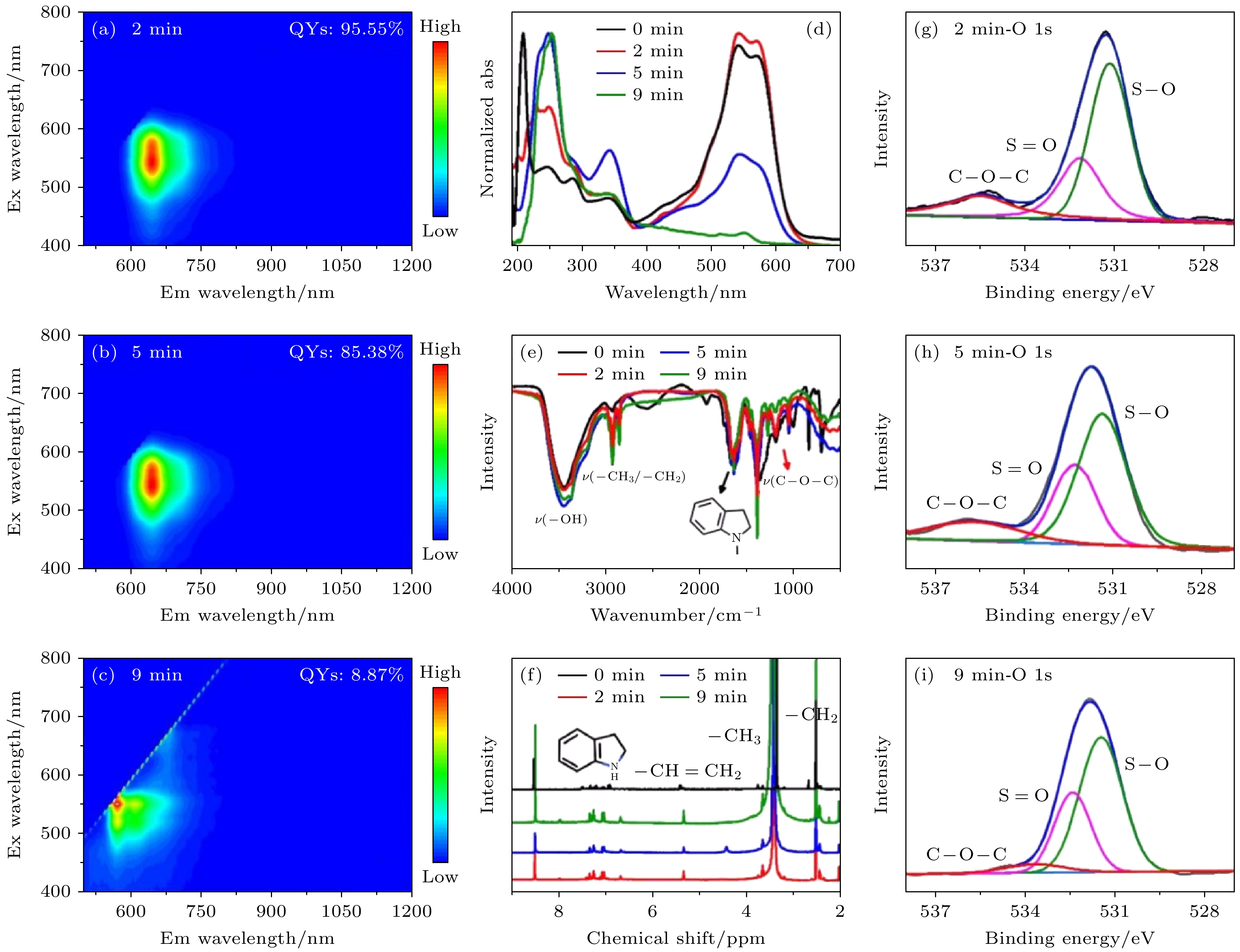 Fig. 5. Comparison between IR806-CDs samples treated with O2 plasma: (a)–(c) Three-dimensional fluorescence spectra; (d) UV–vis absorption spectra; (e) FTIR spectra; (f) H NMR spectra; (g)–(i) high-resolution O 1s XPS spectra of IR806-CDs treated with O2 plasma for 0, 2, 5, and 9 min. Reproduced with permission, Copyright 2024, American Chemical Society[36].