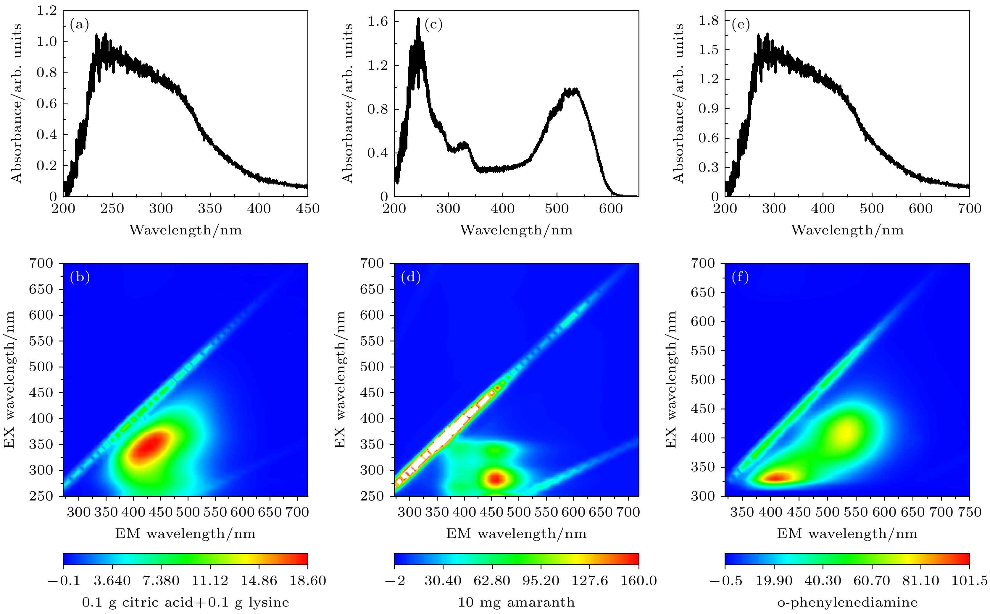 图 6 前驱物分别为(a), (b)一水合柠檬酸和L-赖氨酸(c), (d) 苋菜红(e), (f) 邻苯二胺时制备的碳量子点的紫外-可见光吸收光谱和三维荧光光谱
