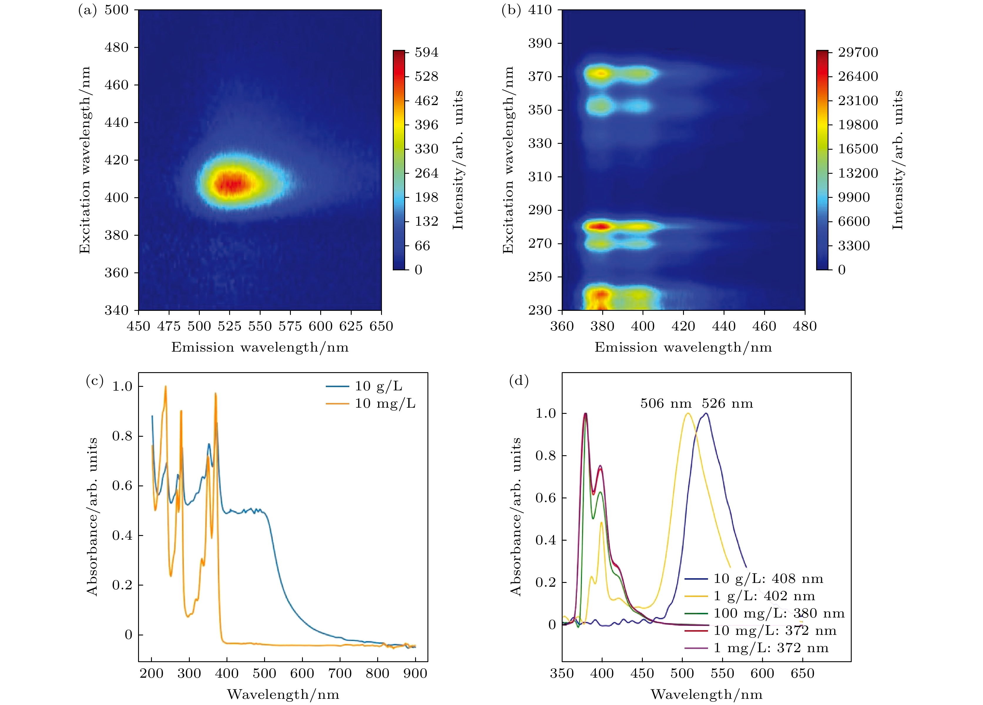 图 7 (a)—(c) 碳量子点浓度分别为10 g/L和10 mg/L的三维荧光光谱和吸收光谱;(d) 不同浓度碳量子点的荧光光谱, 经许可转载[37]