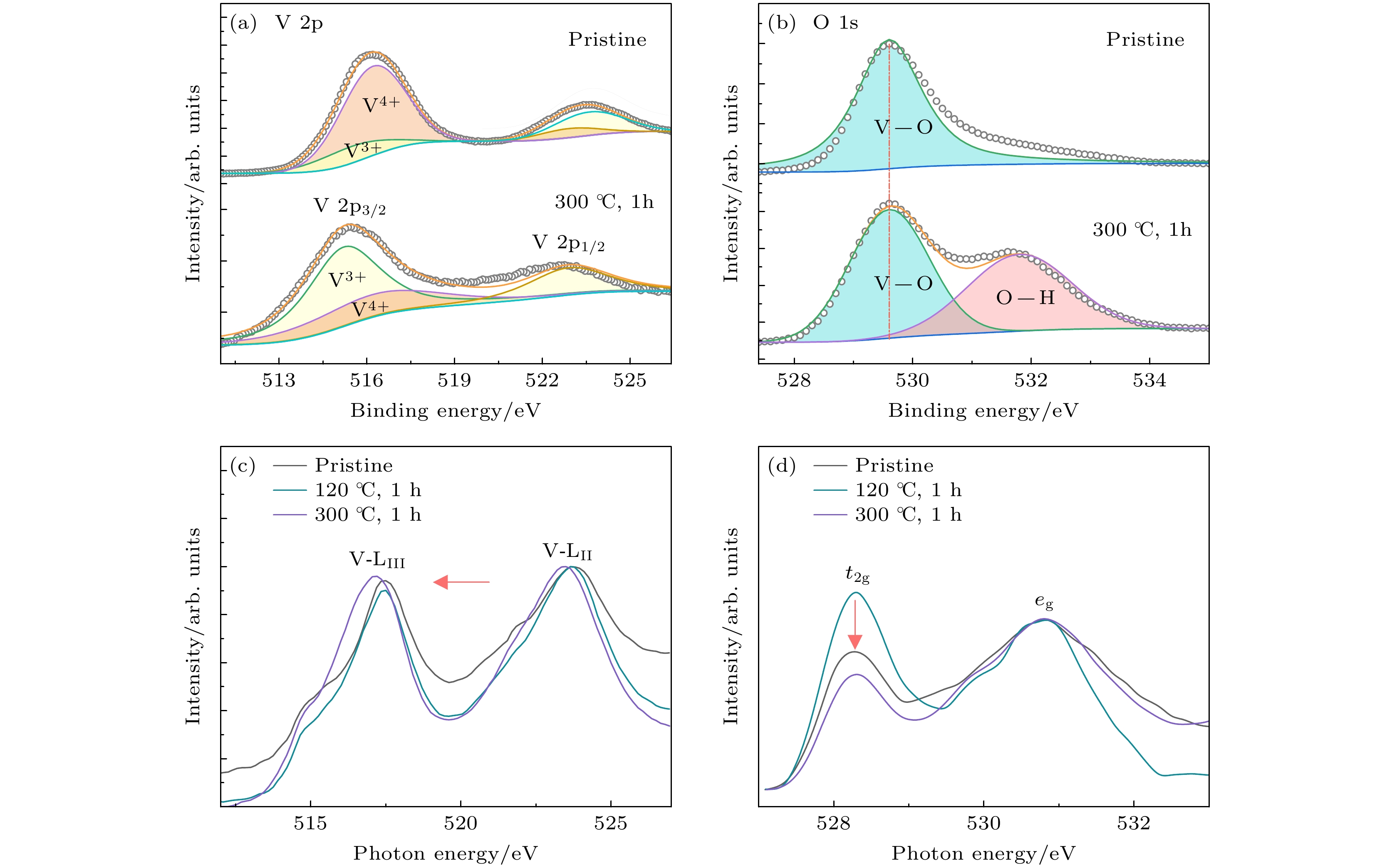 图 4 氢化对VO2(B)/LSMO异质结化学环境与电子结构的调制作用 (a), (b) 氢化前后VO2(B)/LSMO异质结的X射线光电子能谱(XPS); (a) V-2p核心能级; (b) O-1s核心能级; (c), (d) 氢化前后VO2(B)/LSMO异质结的同步辐射软X射线吸收谱(sXAS); (c) V-L边; (d) O-K边