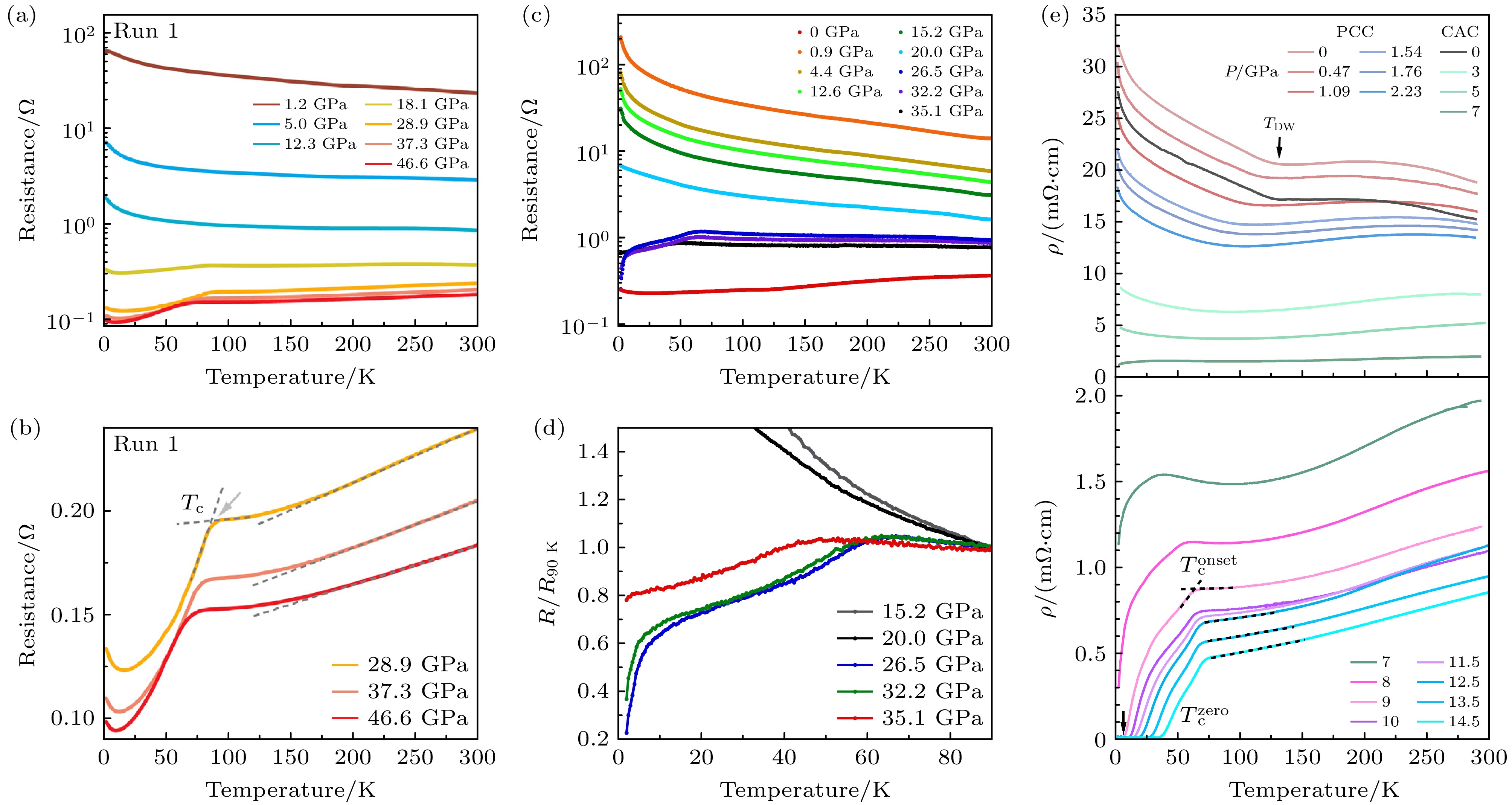 图 3 压力下La3Ni2O7 多晶的超导电性 (a)—(d) 固体传压介质(氮化硼)下La3Ni2O7(固相反应)的电阻曲线[22,23]; (e) 液体传压介质(Daphne 7373, 甘油)下La3Ni2O7(溶胶凝胶法)的电阻曲线[24]