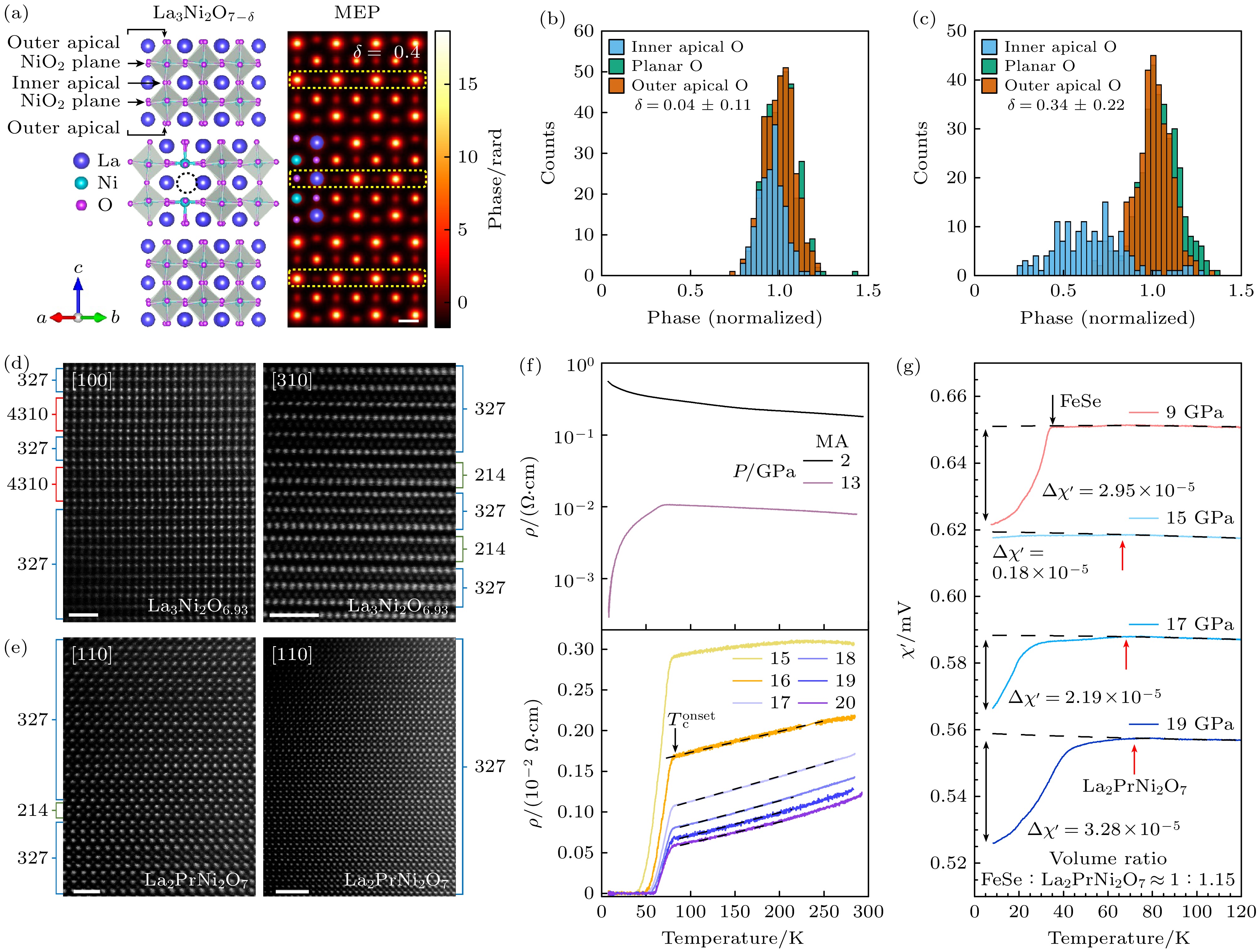 图 4 La3Ni2O7单晶中的氧空位及压力下La2PrNi2O7多晶的超导电性 (a) La3Ni2O7单晶中的氧空位; (b), (c) 不同氧空位含量下不同氧位点的相位直方图[27]; (d) La3Ni2O7多晶中的堆垛缺陷[43]; (e) La2PrNi2O7多晶中的长程有序[43]; (f), (g) La2PrNi2O7多晶在压力下的零电阻和抗磁性[43]