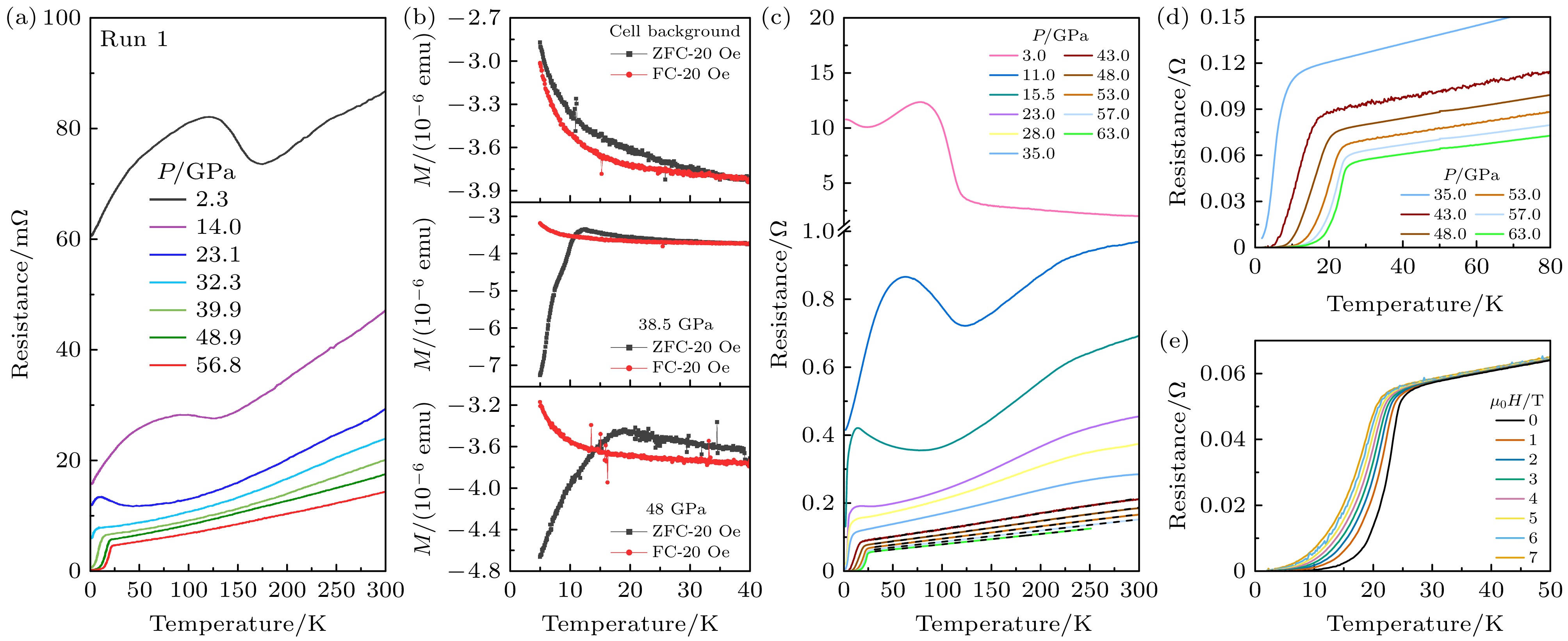 Fig. 5. Superconductivity of La4Ni3O10 single crystal under pressure: (a) Resistance curves of La4Ni3O10 measured with solid as pressure-transmitting medium (NaCl)[3]; (b) the d.c. susceptibility curves of La4Ni3O10 measured with gas as pressure-transmitting medium (neon)[3]; (c), (d) the zero resistance of La4Ni3O10 measured with gas as pressure-transmitting medium (helium)[4]; (e) resistance curves as a function of pressure under various magnetic fields (helium)[4].