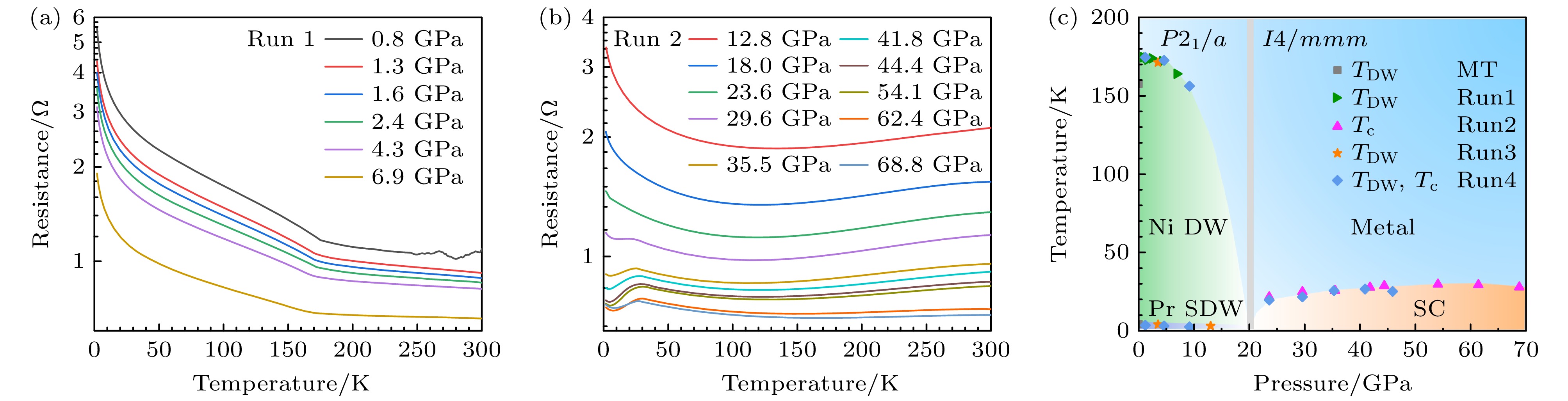 Fig. 8. Superconductivity of Pr4Ni3O10 polycrystalline under pressure[52]: (a), (b) Resistance curves of Pr4Ni3O10 polycrystalline under pressure; (c) superconductivity phase diagram of Pr4Ni3O10 polycrystalline under pressure.