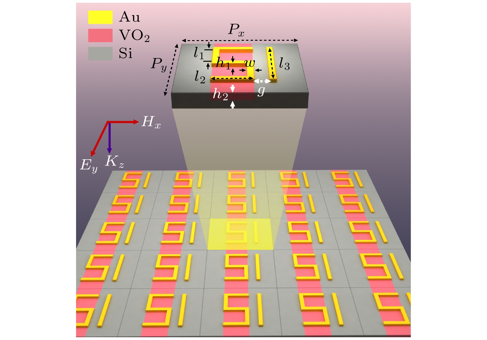 Fig. 1. The proposed metasurface array structure and its unit structure schematic diagram. Among them, $ P_ {x} $ =$ P_ {y} $ = 60 μm, $ l_ {1} $ = 17.5 μm, $ l_ {2} $ = 25 μm, $ l_ {3} $ = 50 μm, w = 5 μm, d = 3 μm, $ h_ {1} $ = $ h_ {2} $ = 0.2 μm.