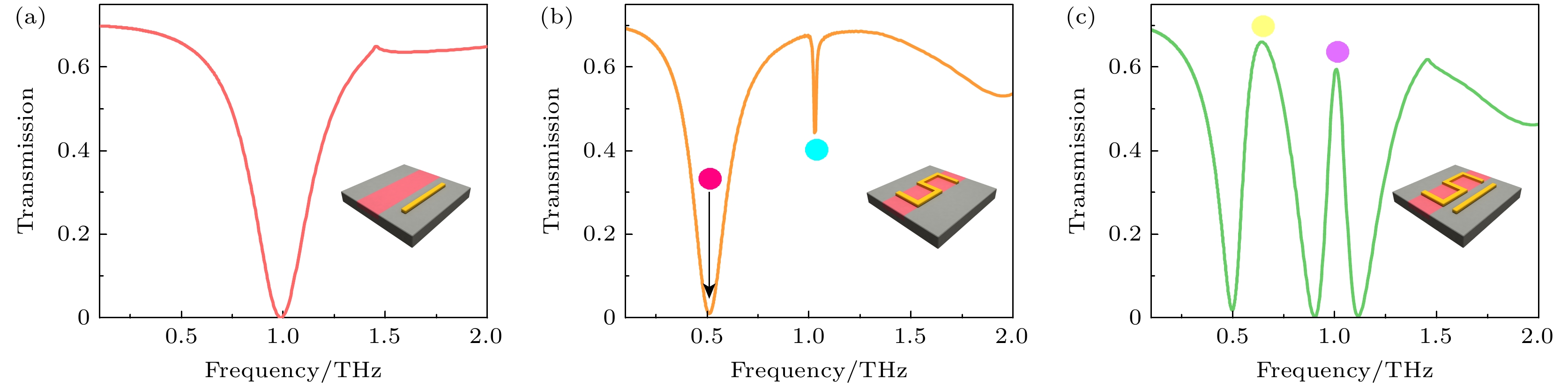 图 9 当VO2电导率σ从20 S/m增加到30000 S/m时, 三种典型结构的透射光谱变化情况 (a) VO2完全覆盖基底表面; (b) VO2位于金纳米条下方; (c) VO2位于S型金开口环下方