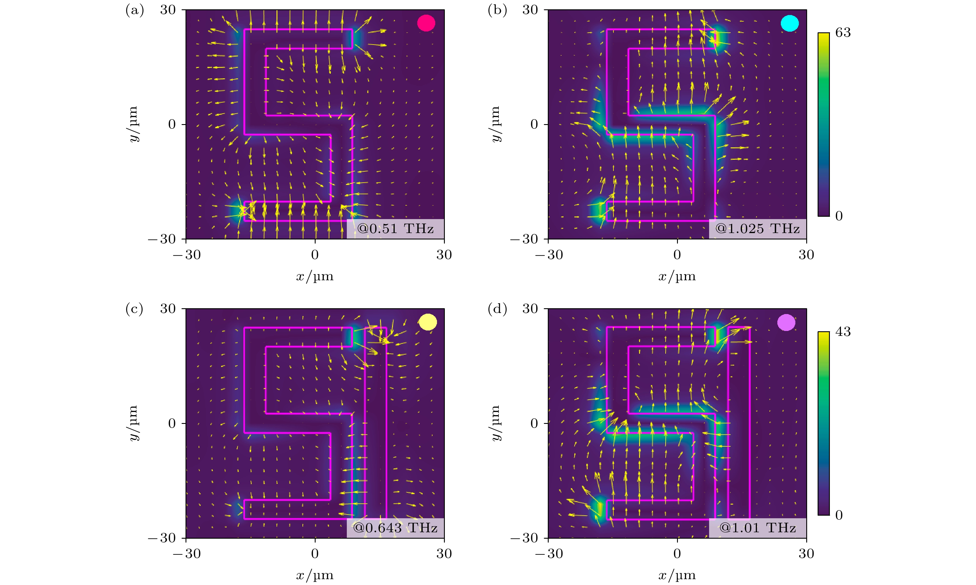 图 3 阵列结构在x-y平面的电场强度分布 (a), (b) S型开口环在0.51 THz与1.025 THz处电场分布; (c), (d) 两个透明窗在0.643 THz和1.01 THz处的电场分布. 粉色线为单元结构轮廓, 黄色箭头表示电场方向, 颜色条为共振强度. 带颜色的实心圆对应图2中透射谱的共振位置