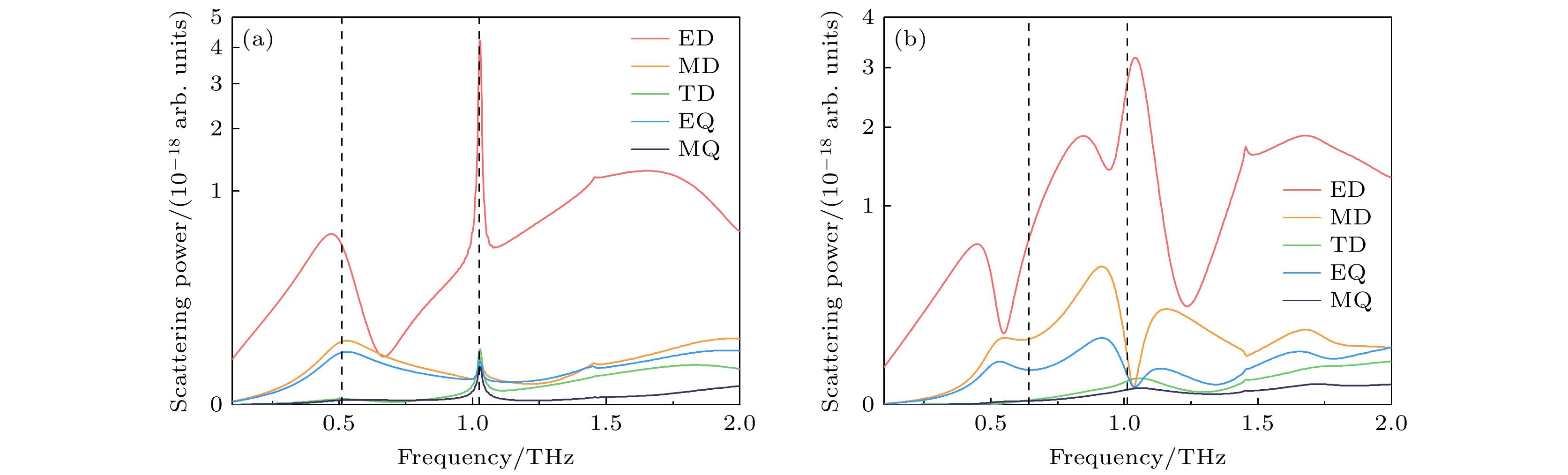 Fig. 5. (a) Scattered power spectra of the S-shaped split-ring; (b) scattered power spectra of the combined structure. ED, MD, TD, EQ, and MQ denote electric dipole, magnetic dipole, ring dipole, electric quadrupole, and magnetic quadrupole, respectively; black dashed lines denote resonance positions.