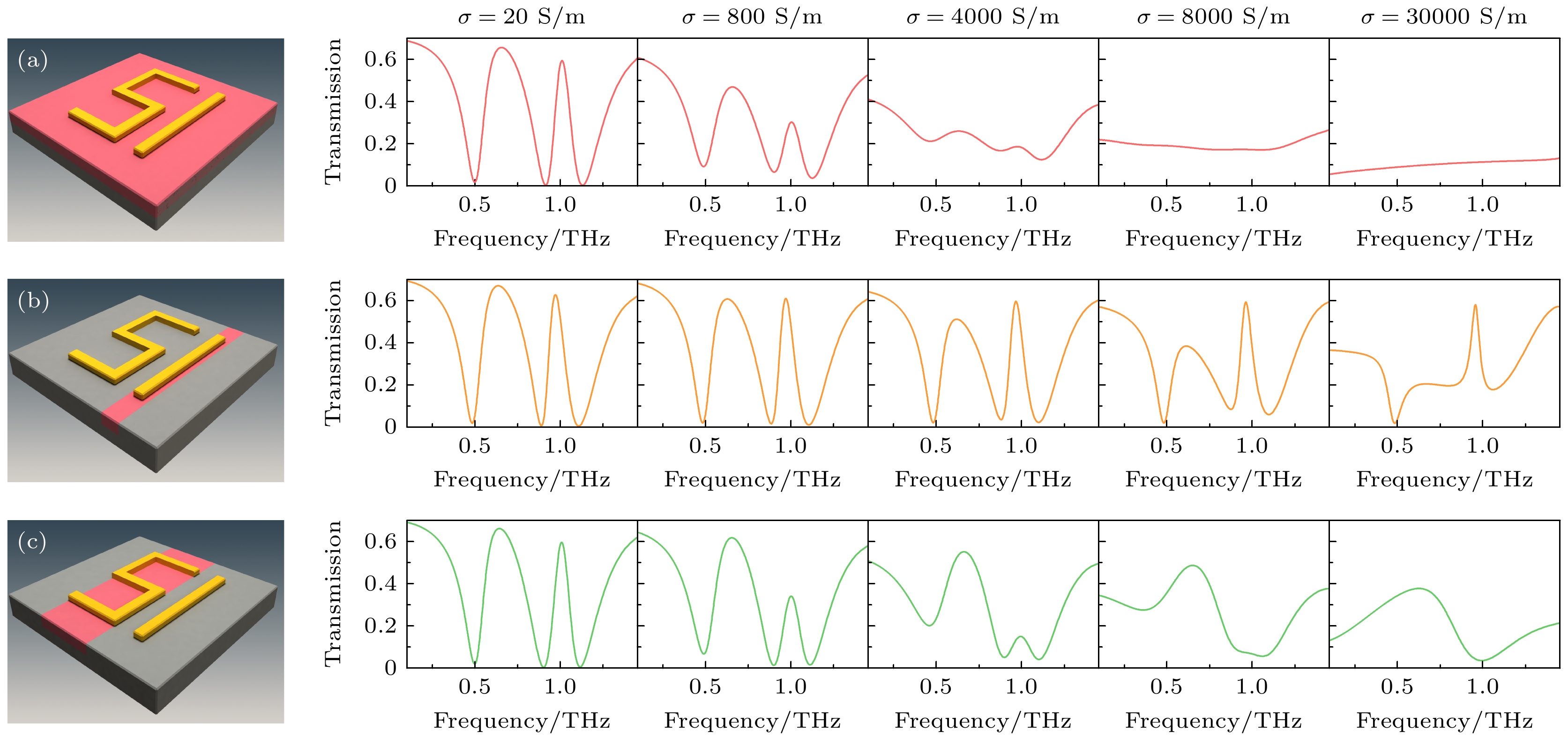 Fig. 9. Evolution of transmission spectra for three characteristic structures as the electrical conductivity σ of VO2 increases from 20 S/m to 30, 000 S/m: (a) VO2 fully covering the substrate surface; (b) VO2 located beneath the gold nanorod; (c) VO2 positioned under the S-shaped split-ring.