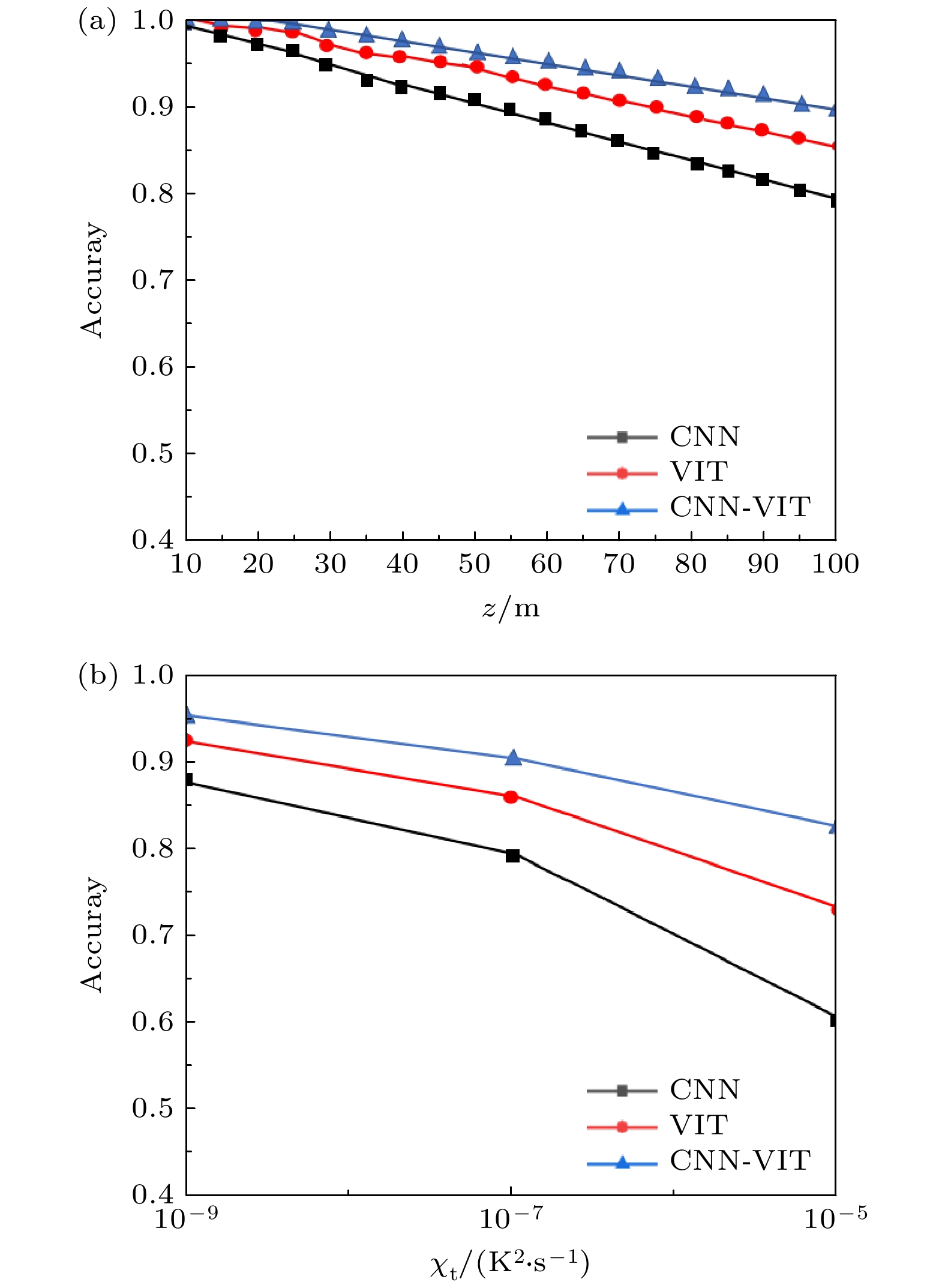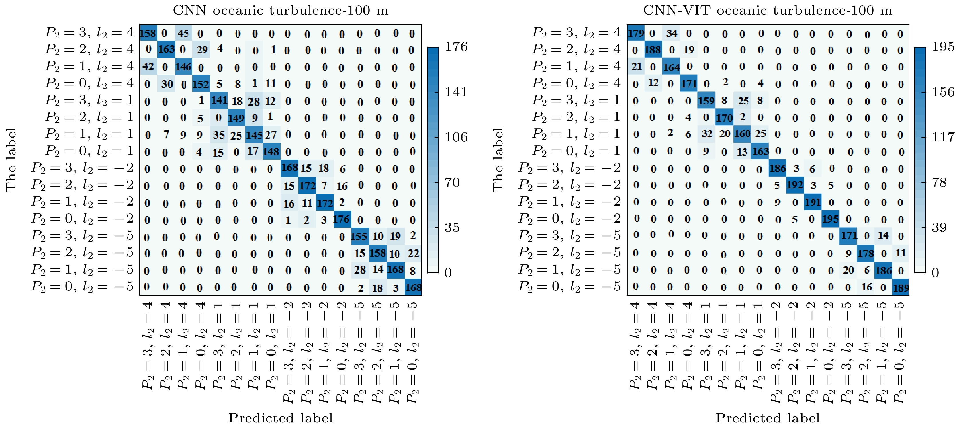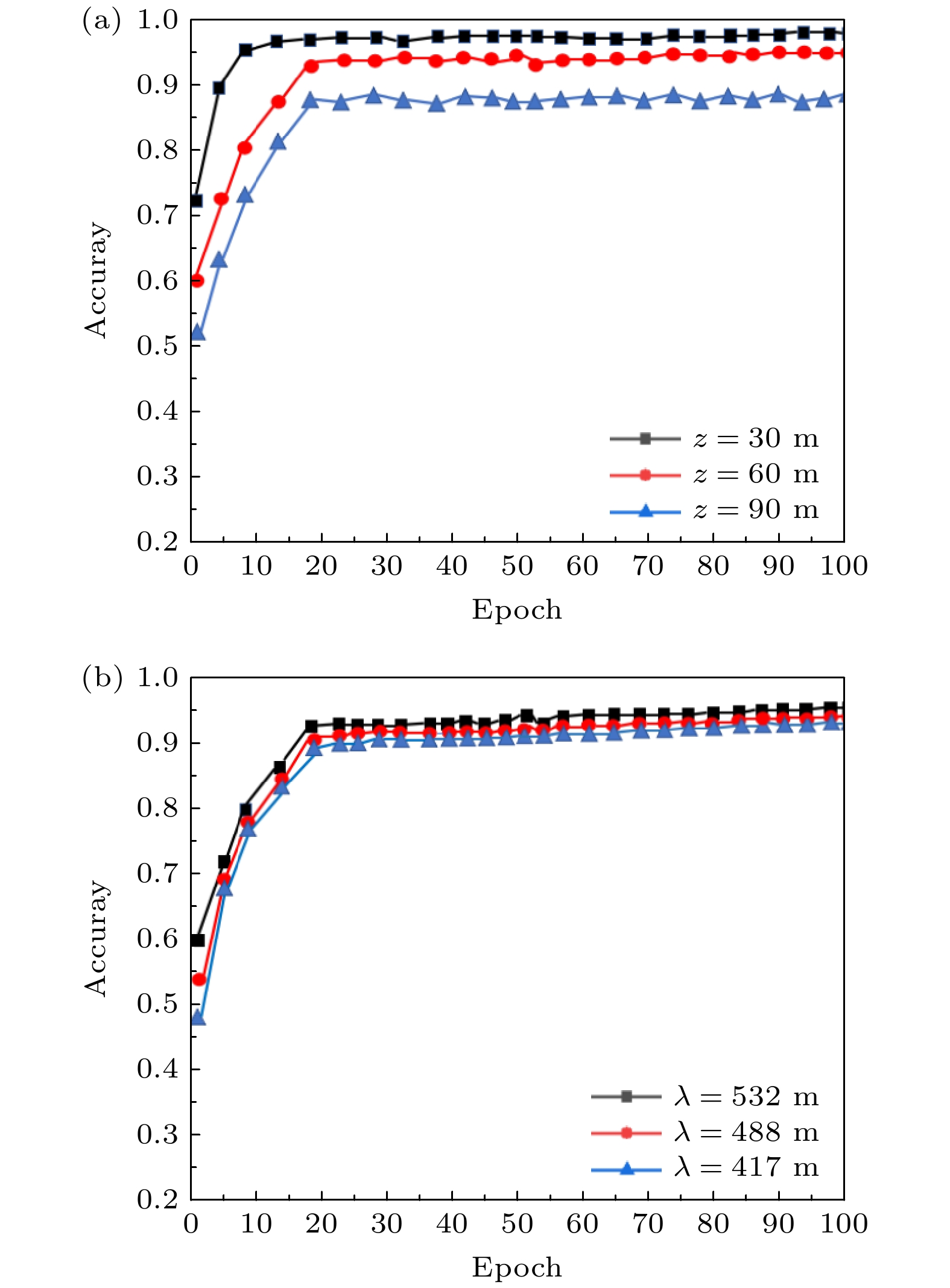 本文提出了一种基于卷积神经网络(convolutional neural network, CNN)与改进视觉变换器(vision transformer, VIT)的涡旋光束叠加态轨道角动量(orbital angular momentum, OAM)模式识别方法. 以海洋湍流畸变的三组拉盖尔-高斯光束模式叠加光场强度分布图为输入, 有机整合了CNN的局部特征提取优势与稀疏注意力机制驱动的VIT的全局快速分类能力, 实现端到端的波前畸变高效精准识别. 通过数值仿真模拟海洋湍流环境叠加态OAM模式, 利用功率谱反演法模拟海洋湍流, 以识别准确率和混淆矩阵作为OAM模式识别的评估指标. 实验结果表明, CNN-VIT模型在不同海洋湍流强度、波长、传输距离和模式间隔条件下均展现出优异的OAM模式识别准确率性能. 与现有的CNN和VIT相比, 本文模型在强海洋湍流条件下识别准确率分别提升了23.5%和9.65%. 这证明了CNN-VIT模型在涡旋光叠加态OAM模式识别的应用潜力.This work proposes a pattern recognition method for the superposition state orbital angular momentum (OAM) of vortex beams based on convolutional neural network (CNN) and improved vision transformer (VIT). Organically integrating the local feature extraction advantages of CNN with the global fast classification ability of VIT driven by sparse attention mechanism, using three sets of Laguerre-Gaussian (LG) beam patterns with superimposed light field intensity distribution maps of ocean turbulence distortion as input, efficient and accurate recognition of end-to-end wavefront distortion is realized. MATLAB numerical simulation is adopted to simulate the superposition state LG beam in ocean turbulent environment, power spectrum inversion method is used to simulate ocean turbulence, and recognition accuracy and confusion matrix are used as evaluation indicators for OAM pattern recognition. The experimental results show that the CNN-VIT model exhibits excellent performance in OAM pattern recognition accuracy under different ocean turbulence intensities, wavelengths, transmission distances, and mode intervals. Compared with existing CNN and VIT, the proposed model improves recognition accuracy by 23.5% and 9.65% respectively under strong ocean turbulence conditions, thus exhibiting strong generalization ability under unknown ocean turbulence strengths. This demonstrates the potential application of the CNN-VIT model in OAM pattern recognition of vortex light superposition states.