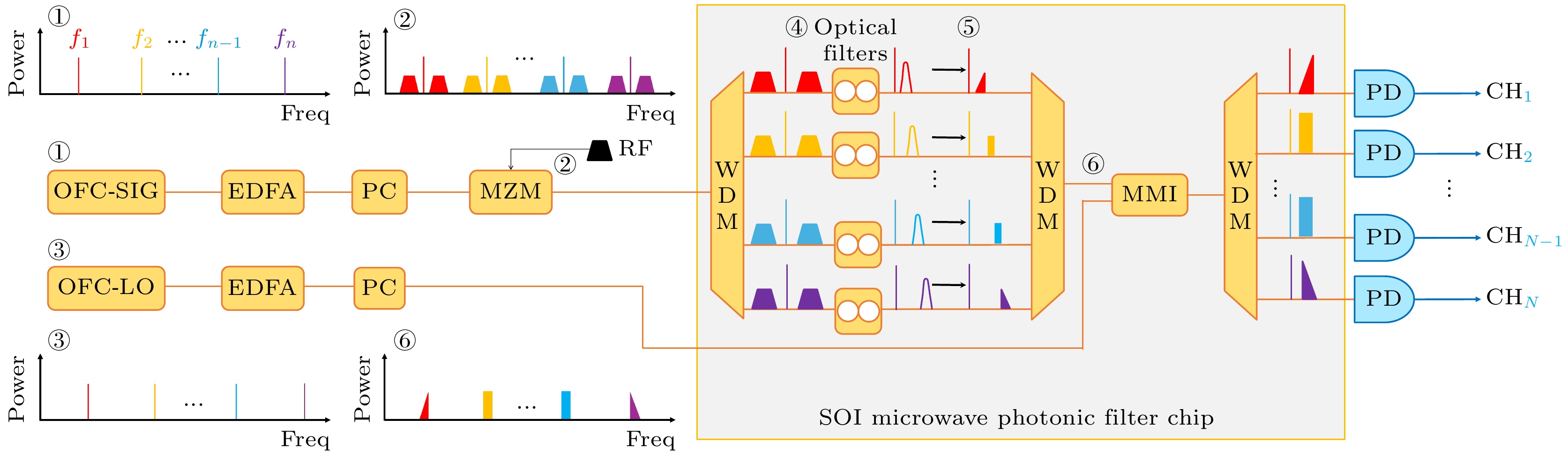 To meet the growing demand for high-frequency broadband signal processing in complex electromagnetic environments and to overcome the limitations of traditional electronic systems such as restricted bandwidth, limited response speed, and low integration density, this paper presents a reconfigurable microwave photonic channelized receiver chip implemented on a silicon photonic platform. The proposed architecture adopts a two-stage optical filtering strategy that circumvents the typical strict wavelength alignment requirements in traditional designs, thereby greatly alleviating the challenges of system integration. In the first stage, the cascaded Mach-Zehnder interferometer (MZI)-based wavelength division multiplexers (WDMs) are used to perform Gaussian-shaped filtering of the input optical spectrum with a channel spacing of approximately 200 GHz. The second stage combines an array of coupled resonator optical waveguide (CROW) filters functioning as finely tunable bandpass elements. These CROW filters utilize curved waveguide directional couplers, which are specifically designed to address the issues found in traditional multimode interference (MMI) couplers such as high insertion loss—and in straight directional couplers, which encounter significant coupling dispersion. The optimized curved coupler exhibits an insertion loss below 0.03 dB and a coupling ratio variation of less than 10% across the 1500–1600 nm wavelength band. Filter bandwidth reconfigurability is achieved via thermo-optic tuning of the balanced MZI embedded within each CROW filter, enabling dynamic adjustment of the coupling coefficients. Each filter exhibits a continuously adjustable 3 dB bandwidth ranging from 2.25 GHz to 3.12 GHz, with an excellent 20 dB/3 dB shape factor of 3.08. This performance indicates significantly improved roll-off characteristics compared with the performance of traditional filter designs, leading to enhanced suppression of image frequency components and improved signal separation fidelity. A complete microwave photon channelized receiving link is constructed using an integrated WDM-CROW filter bank. System-level simulations confirm that the architecture provides excellent broadband adaptability, supporting the channelization of radio frequency (RF) signals in two operational bands: 8–28 GHz and 8–36 GHz. The system efficiently decomposes the input wideband RF signal into eight independent intermediate frequency (IF) sub-bands. Within each sub-band, an image rejection ratio (IRR) exceeding 22 dB is maintained. The corresponding IF ranges are 1.4–3.6 GHz when configured for 8–28 GHz RF input, and 2–5 GHz for 8–36 GHz input, covering critical communication and detection bands from X-band to K-band and satisfying the requirements of multi-scenario signal processing. Furthermore, we simulate the reception and reconstruction of a 5 GHz bandwidth linear frequency-modulated (LFM) signal, successfully verifying the chip’s capability in handling wideband waveforms. These results underscore the feasibility of the proposed chip as a high-performance solution for advanced applications such as radar detection and broadband electronic warfare systems, offering a novel, integrated photonic alternative to traditional channelized reception architectures. -